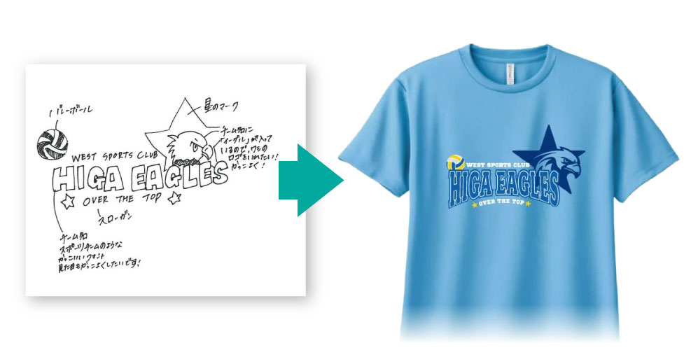 オリジナルデザインはデジタルでも手描きでもOKです。Tシャツデザイン集から選ぶのもおすすめ。詳しくはこちら