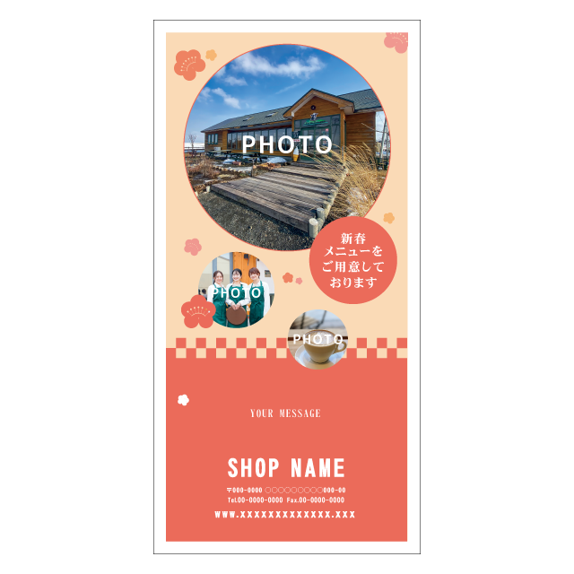 飲食店のご挨拶やお得なクーポンとして利用いただけるデザインテンプレートです。