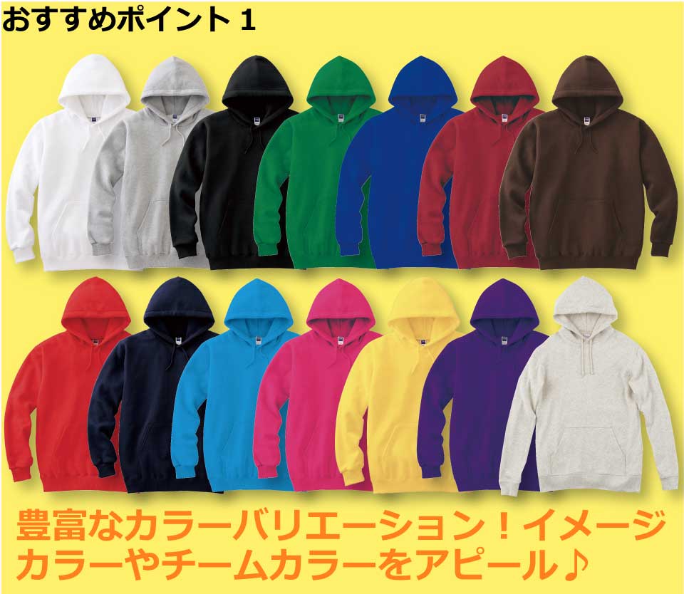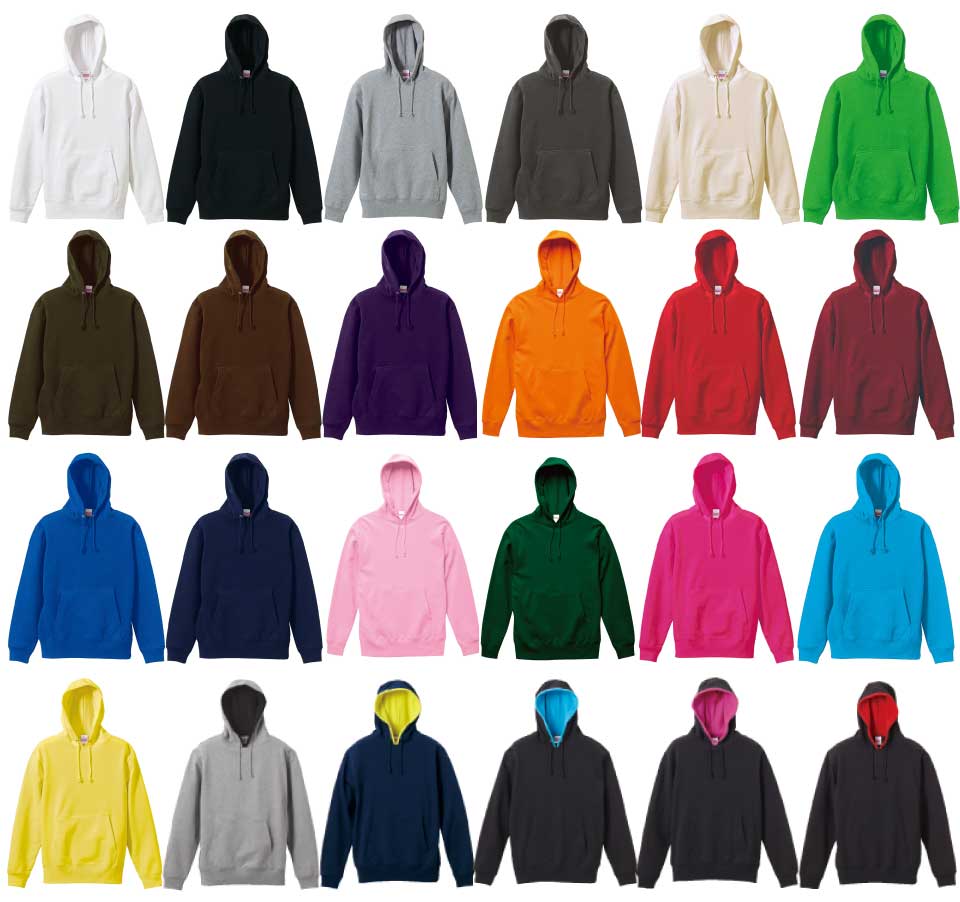 ベーシックなモノトーンカラーからコンビカラーまで、なんと全24色の豊富なバリエーション!な かなか見られないオレンジパーカーも人気です。