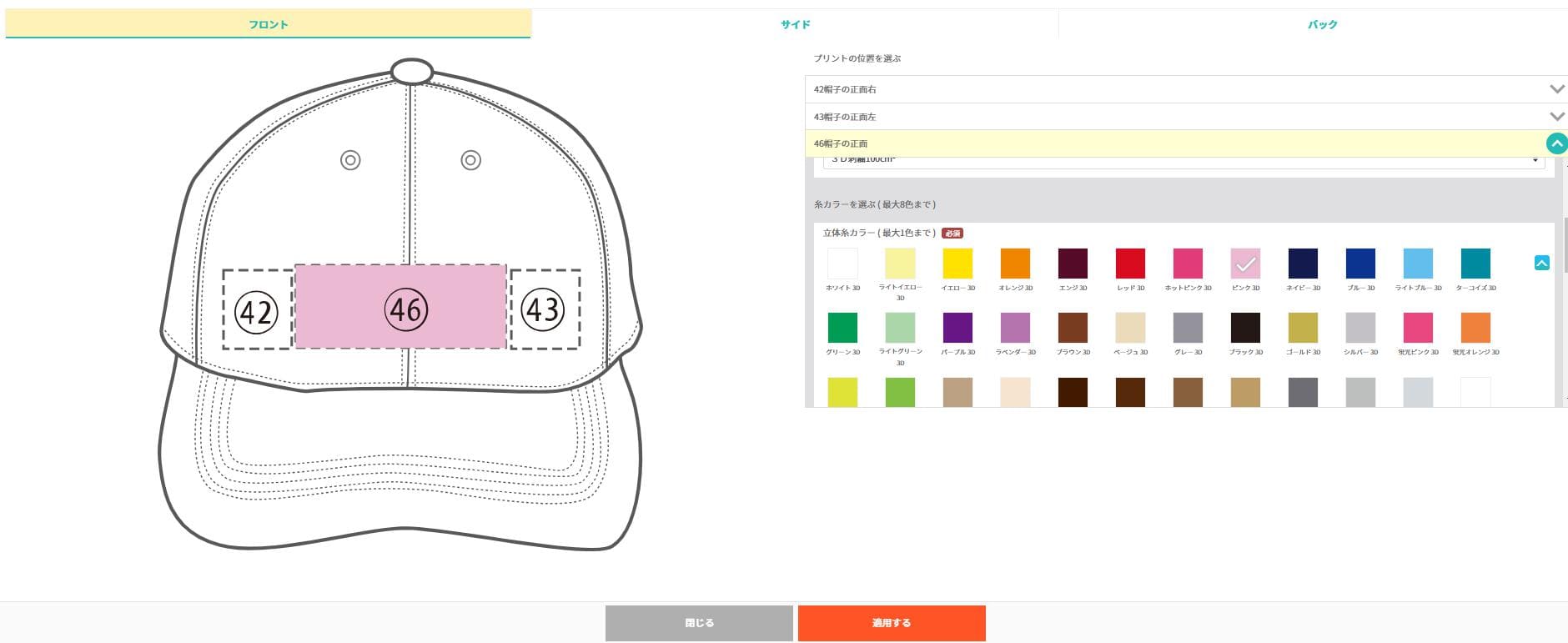 刺繍の糸カラーは最大8色までご選択いただけますが、3D(立体)にできるのは、1色のみです。ご注文の際は、ご選択いただいた色の中から3D刺繍にしたい色を1色、「その他ご要望」欄にご記入ください。
