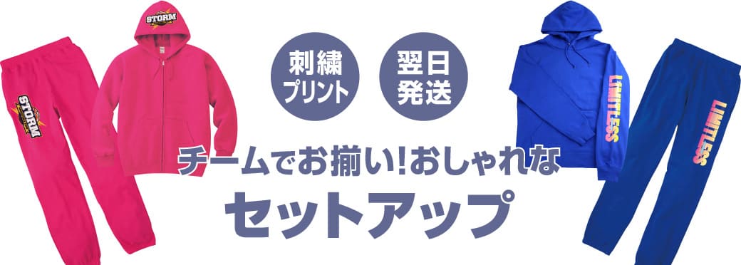 オリジナルセットアップを激安でプリント・作製ならCLAT-JAPANへ! スポーツやサークル活動、部活や学園祭に人気のスウェットとパンツ上下のセットアップ。涼しく着られるドライ素材のものから、防寒対策にばっちりの裏起毛アイテムまでシリーズごとにご覧いただけます。名入れ刺しゅうやフルカラーの写真印刷、チームロゴなど幅広いプリント方法に対応しています。1枚の製作から大量オーダーまでおまかせください。