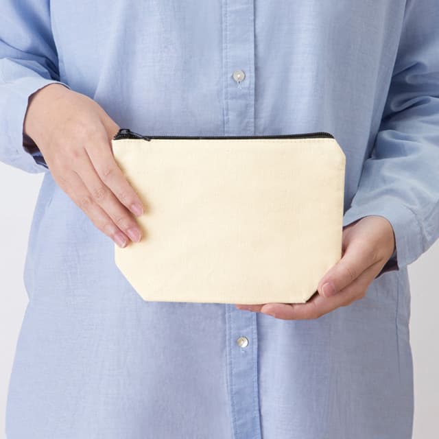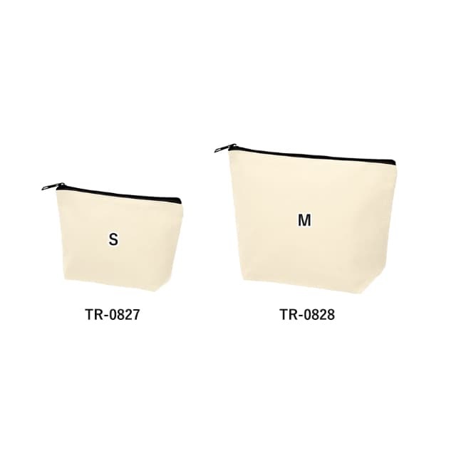 TR-0827 | MARKLESS STYLEしっかり収納できて持ちやすいキャンバス生地のポーチです。舟底型のシルエットでマチがあるので、化粧道具やステーショナリー、かさばる小物をしっかり収納できます。バッグに入れてもかさばらない小物ポーチはノベルティに人気。男性女性ともに使いやすいシンプルデザイン。大量にグッズを作製したい場合にもおすすめな商品です。こちらはMサイズ(品番:TR-0828)もございます。