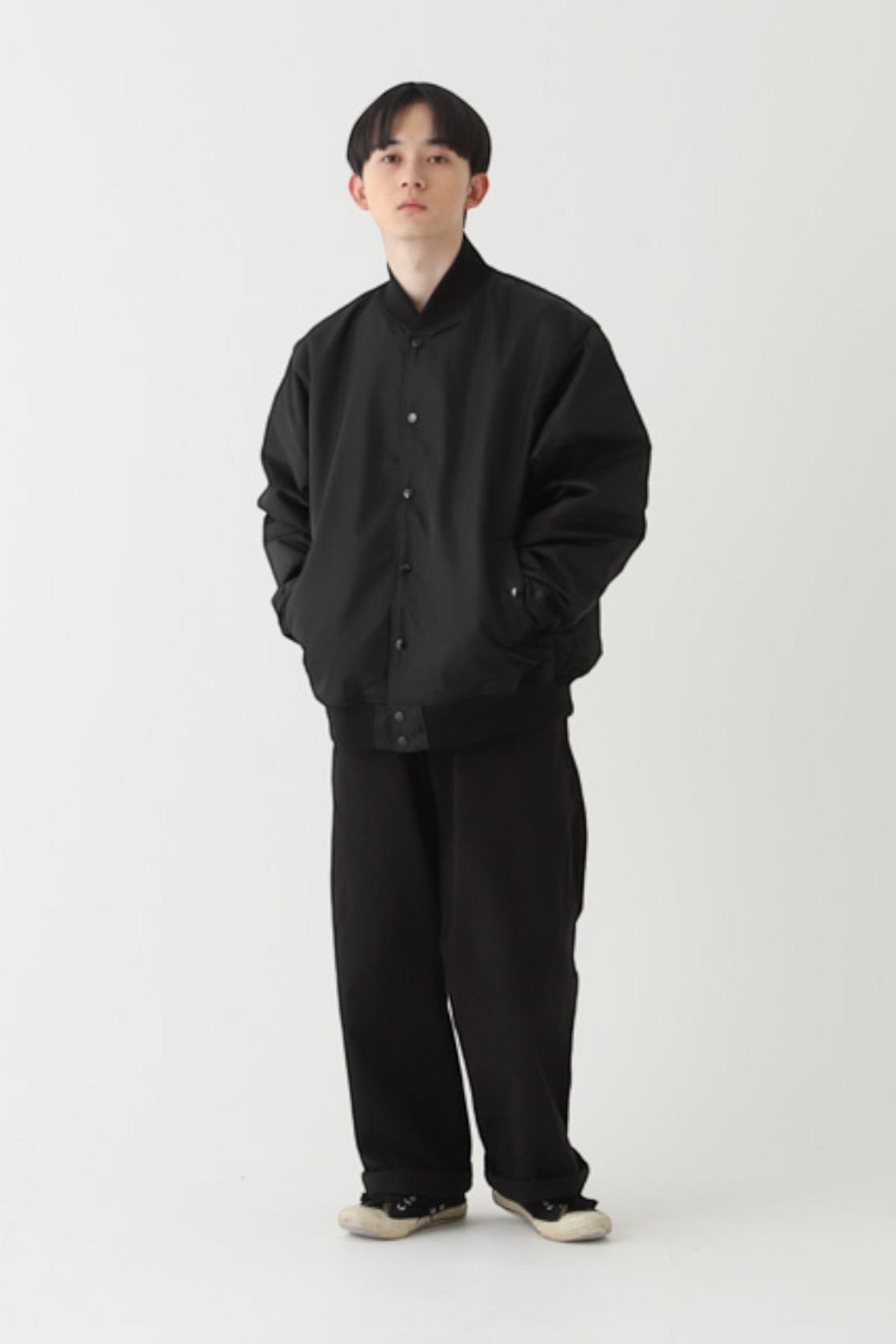 表地はナイロン素材で、落ち着いた光沢感で高級感のある雰囲気が特徴。形はゆったりめのリラックス感をもたせたバルーンシルエット。