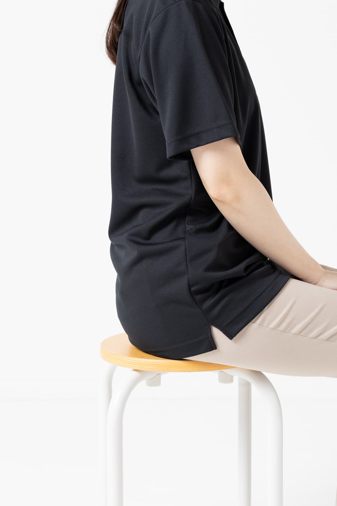 首元は柔らかく伸縮性があり、すその両端に切れ込みを入れてあるので動きやすく、ユニフォームとしてもアクティブなシーンでも快適に過ごせます。えり元のボタンでいつでも温度調節ができ、汗をかいてもすぐに乾くので、暑い日でもさらりと心地よく着られます。サイズやカラー展開も豊富で、幅広い年代や体型の方でも安心して選びやすいです。