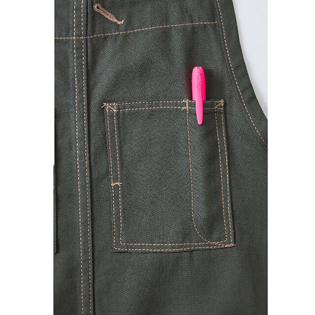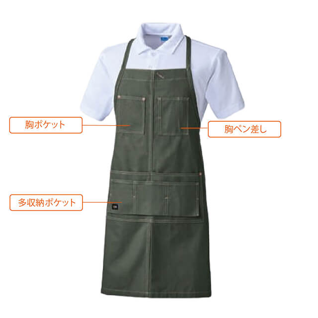 10131 | SOWA通気性と耐久性に優れたキャンバス生地を使用した首掛けエプロン。首と腰に紐を巻くタイプなので体にもフィットして動きやすいです。カラーはブルー、アーミー、ライトブラウンの3色展開で、エプロン素材に映えるステッチがおしゃれです。ペン差しや6つのポケット付いているので、収納力、実用性ともにバツグンです。フリーサイズなのでユニセックスでお使いいただけます。DIYやガーデニング、料理時など様々な用途にご使用できます。