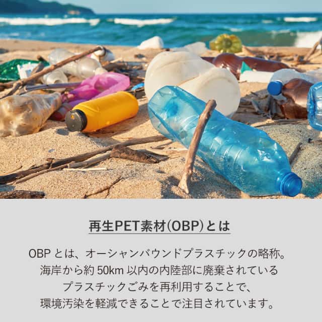 TR-1369 | MARKLESS STYLE「OBP」を使用した、環境にやさしい再生ペットボトルから作られたバッグです(OBPとは「オーシャンバウンドプラスチック」の略称で、海岸から約50km以内の内陸部で放置されているプラスチックごみを再利用した、今注目の素材です)。海をイメージさせる3色展開で、こちらのバッグはフラットな薄型仕様。持ち手部分は肩掛けができる便利な長さになっています。環境関連のイベントでの資料配布にもぴったりな商品です。海あり県のアンテナショップでのオリジナルグッズにもいかがですか。