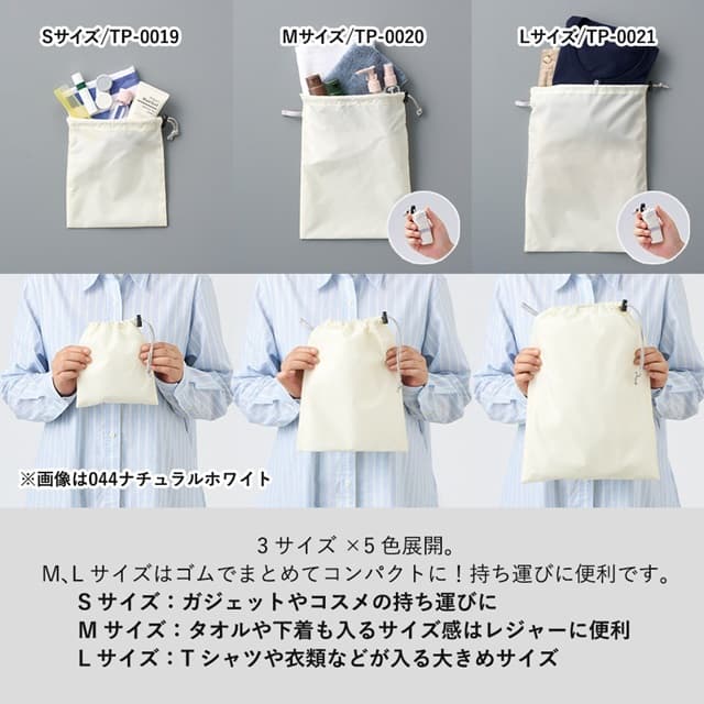 TP-0019 | MARKLESS STYLEカジュアルな雰囲気のおしゃれな巾着ポーチ。しなやかでさらっとした手触りが特徴の、ポリエステル生地を使用しています。薄手のポリエステル素材と、アウトドアをイメージさせるようなストッパーやひもは相性抜群! S・M・Lの3サイズ展開なので、旅行の際にお使い頂くのにも便利です。Sサイズはよく使う小物やコスメ類を入れるのにちょうど良い大きさになっています。ユニセックスでお使い頂けるので、カップルポーチにもいかがですか。