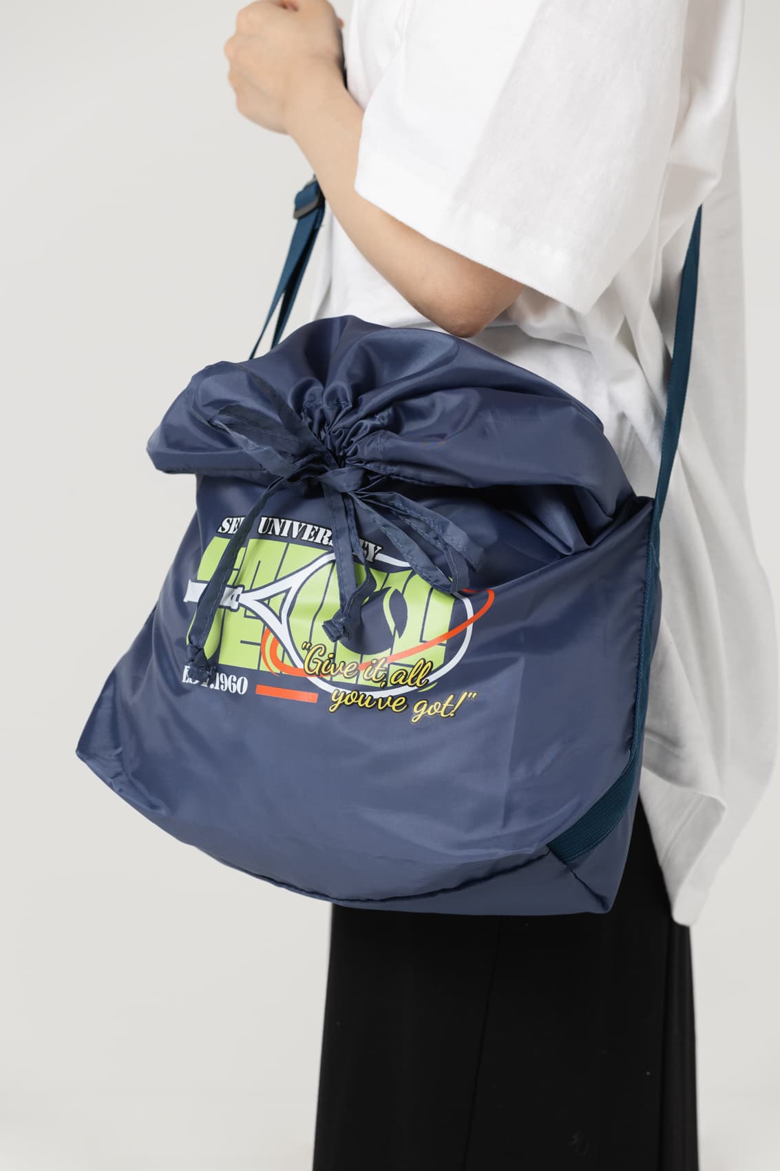 TR-1365 | MARKLESS STYLE巾着型のショルダートートバッグ。バッグの口元を折り返して使用するデザインですが、荷物の大きさや量の変化に対応できるようになっています。肩ひもは調節パーツ付きで、お好きな長さに調節が可能。シンプルでカジュアルな印象の、どなたにもお使いいただきやすい商品です。普段使いにはもちろん、水筒やカーディガンなどの衣類を入れてちょっとした遠出にも便利なサイズです。A4書類が入るので、カレッジグッズなど学生向けアイテムとしてもおすすめです。