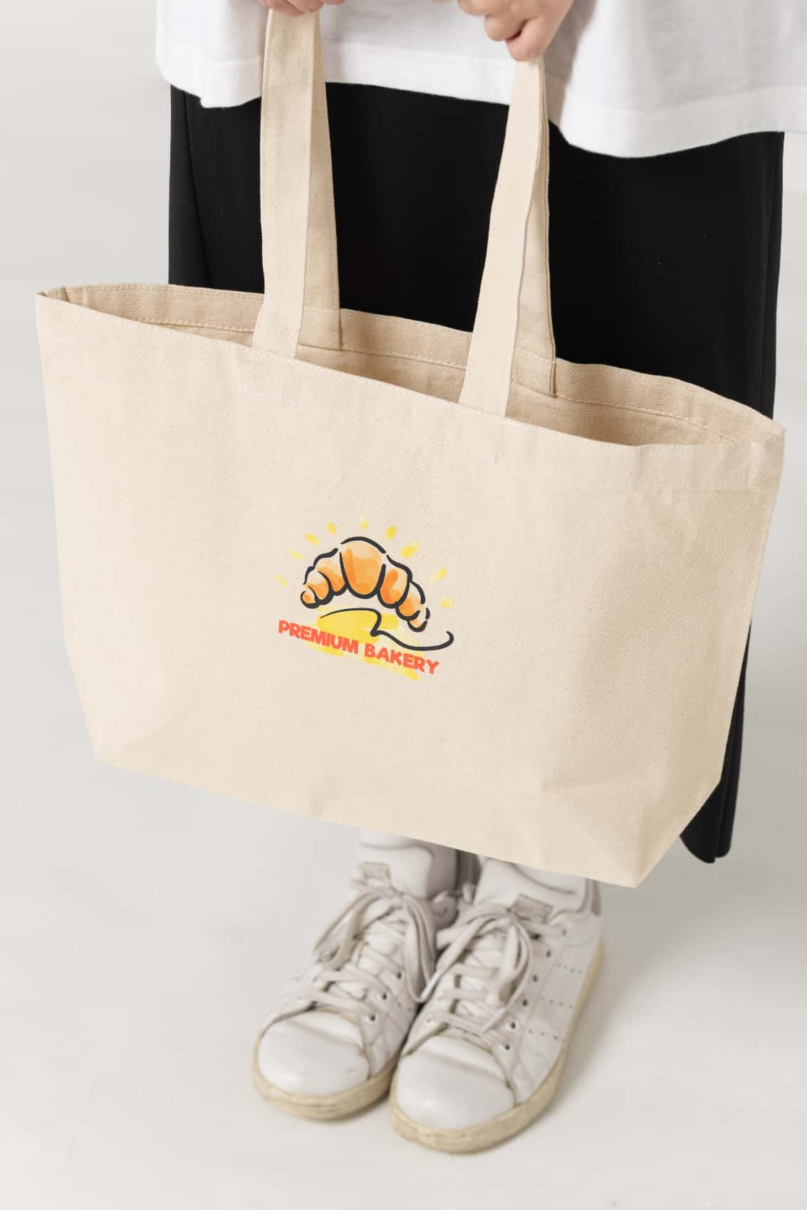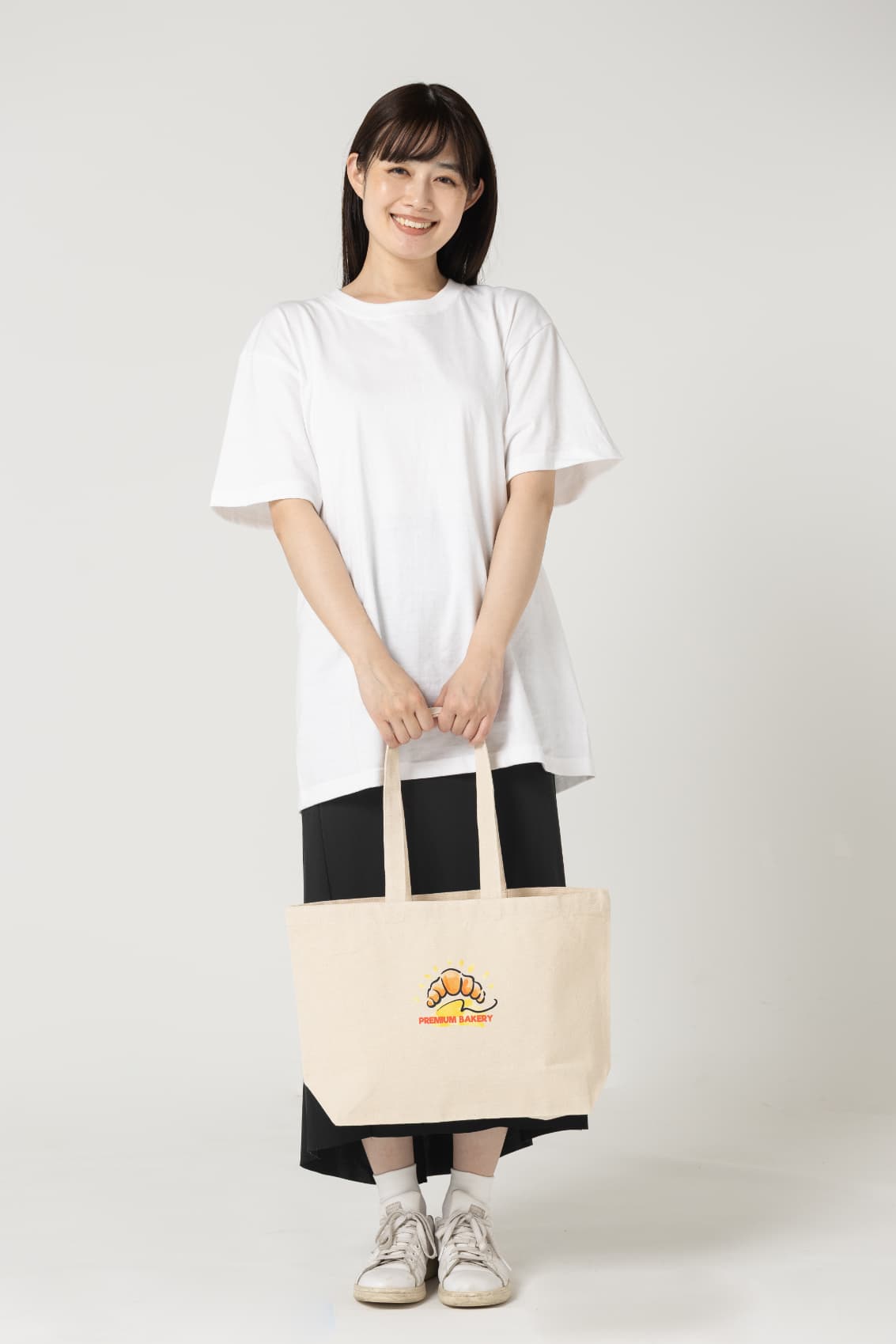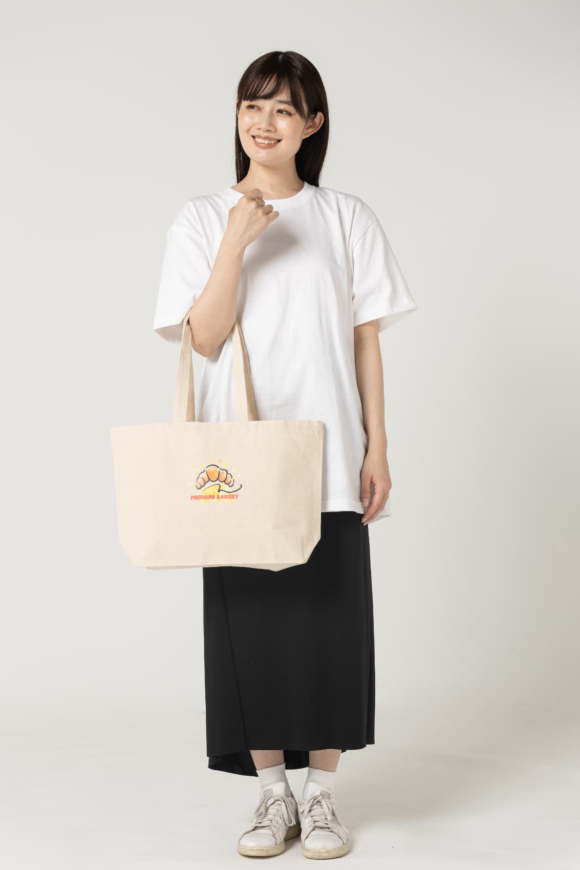 TR-1381 | MARKLESS STYLE横広シルエットがおしゃれな雰囲気のトートバッグです。使い勝手の良い、程よい生地厚が人気の10オンスキャンバスコットンを使用しています。縦サイズが短いので中のものを取り出しやすく、A4書類やノートパソコン、タブレットなどを収納できるため通勤・通学にもおすすめです。持ち手は肩掛けしやすい長さで日常使いにぴったり。プリントや刺しゅうを施して、イベントグッズやオリジナルノベルティを作ってみませんか。