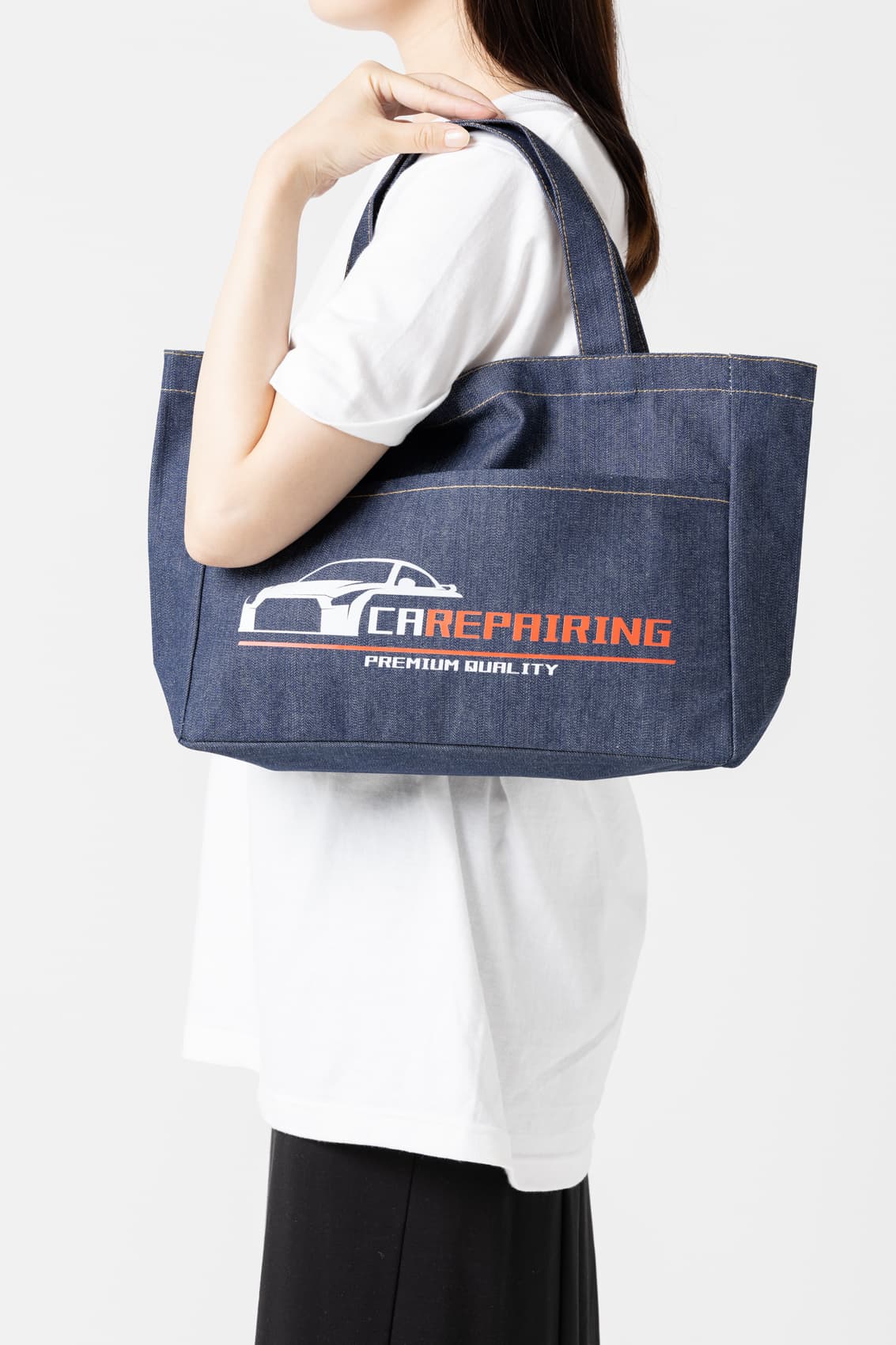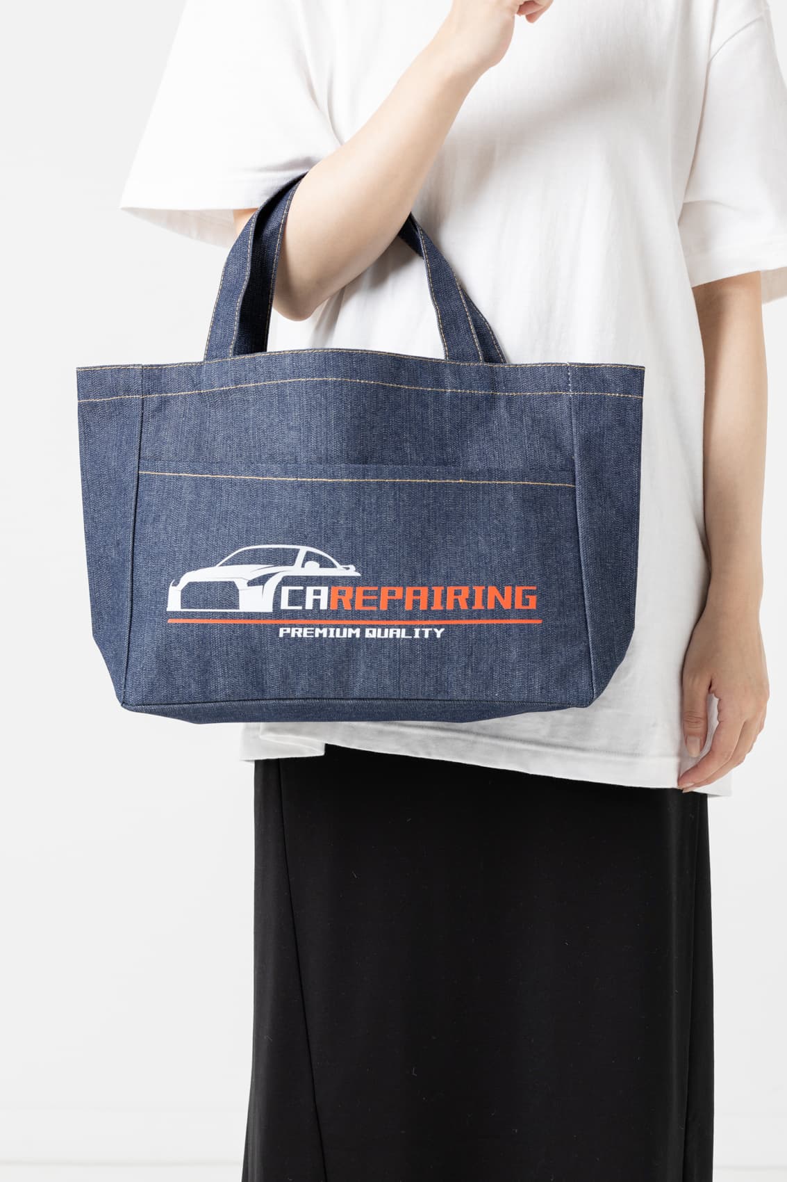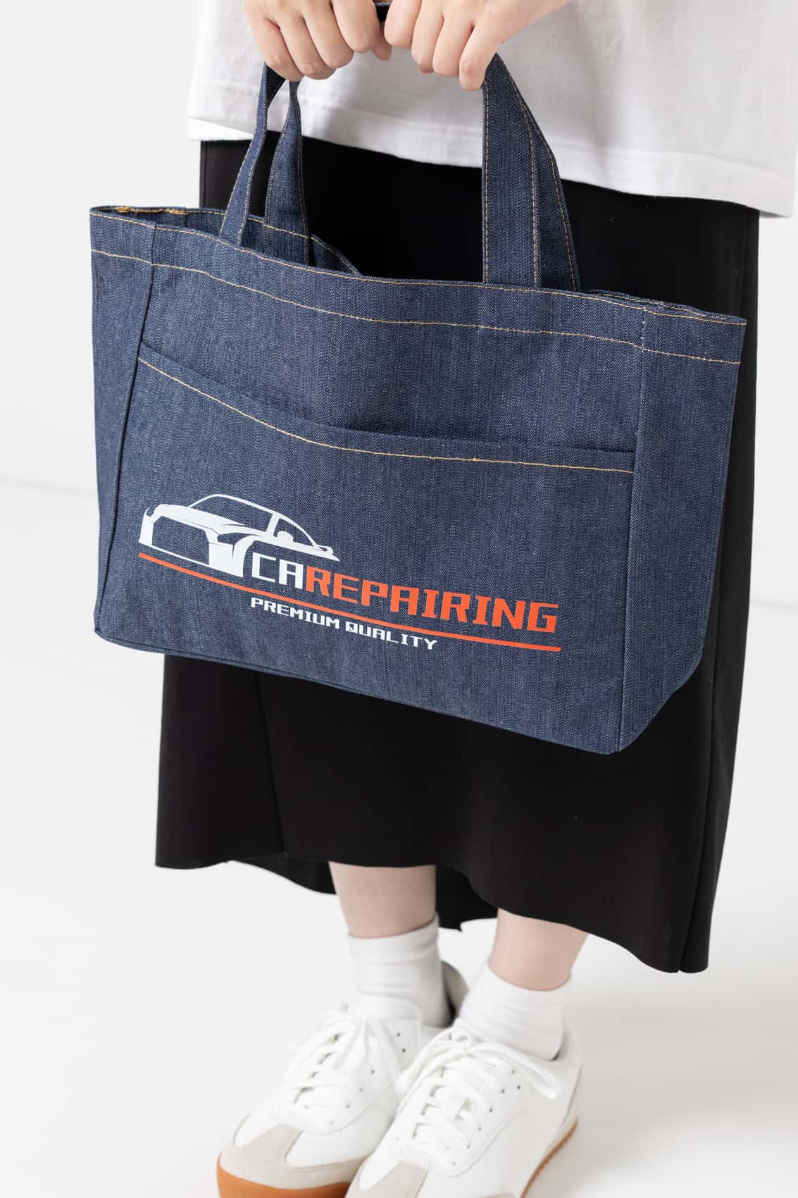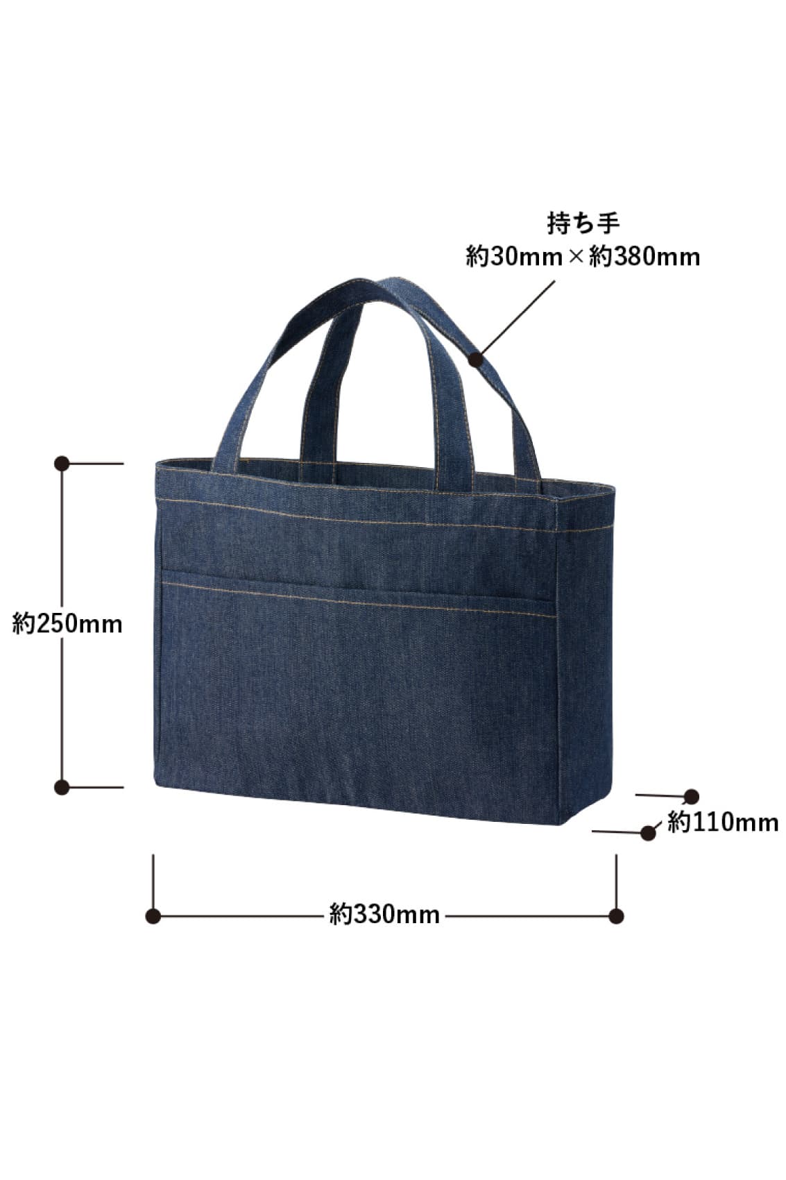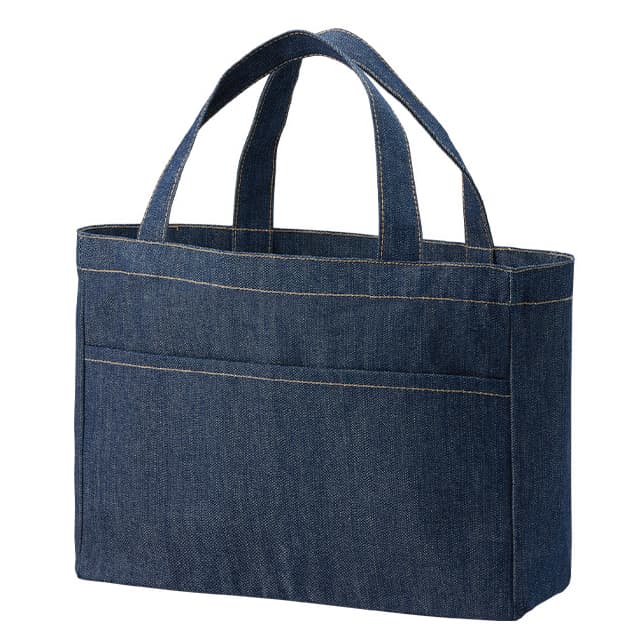 カジュアルなデニム生地を使用した、横型のトートバッグです。丈夫な厚みで荷物の多いシーンでも安心!A4サイズが横向きに入るサイズで、きちんとした印象を与える角形シルエットはお稽古バッグにもピッタリです。また企業ノベルティや、ブランドロゴやイラストをでデザインして物販用としてもおすすめです。フロント部分には外ポケットがついており、メモなどの小物を入れたり荷物の仕分けができるので、バッグの中をすっきりお使いいただけます。デザインのご相談もどうぞお任せください。