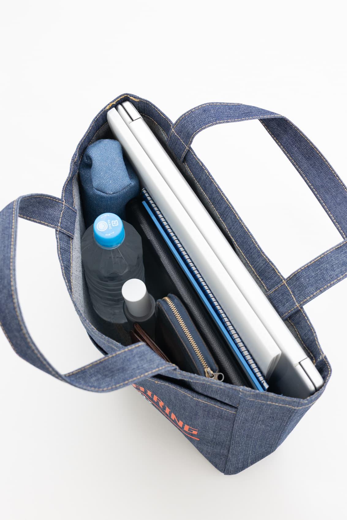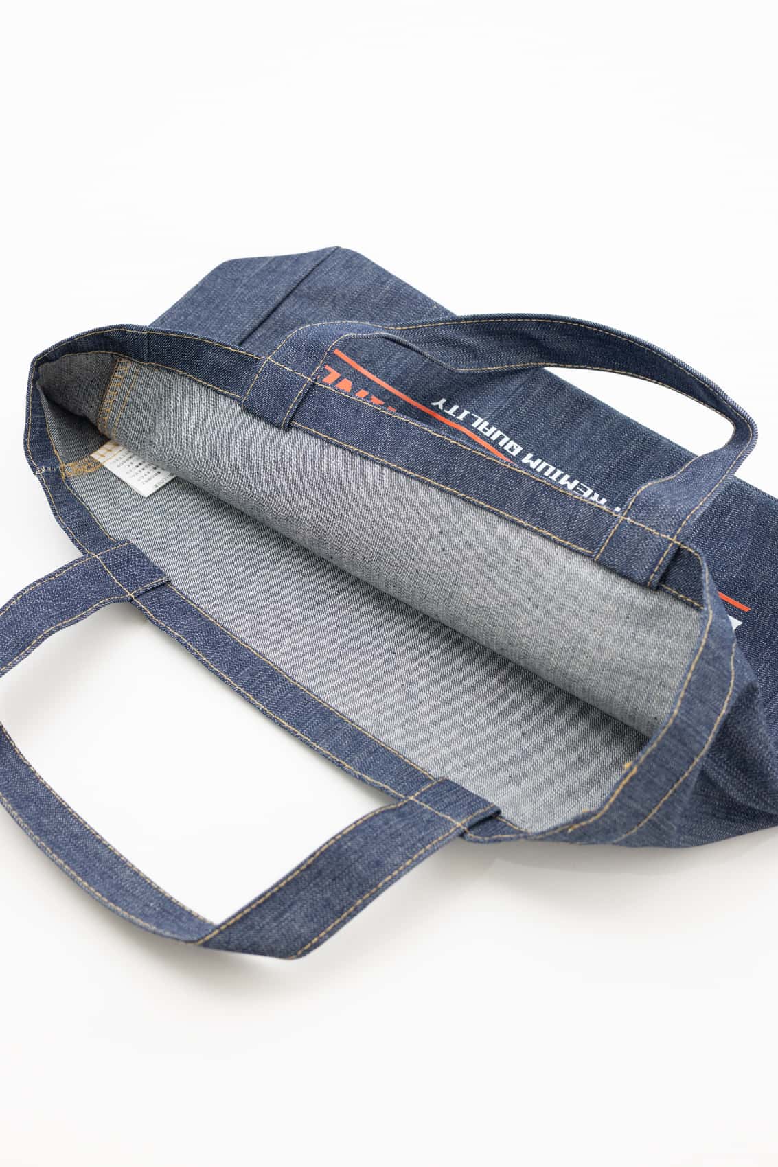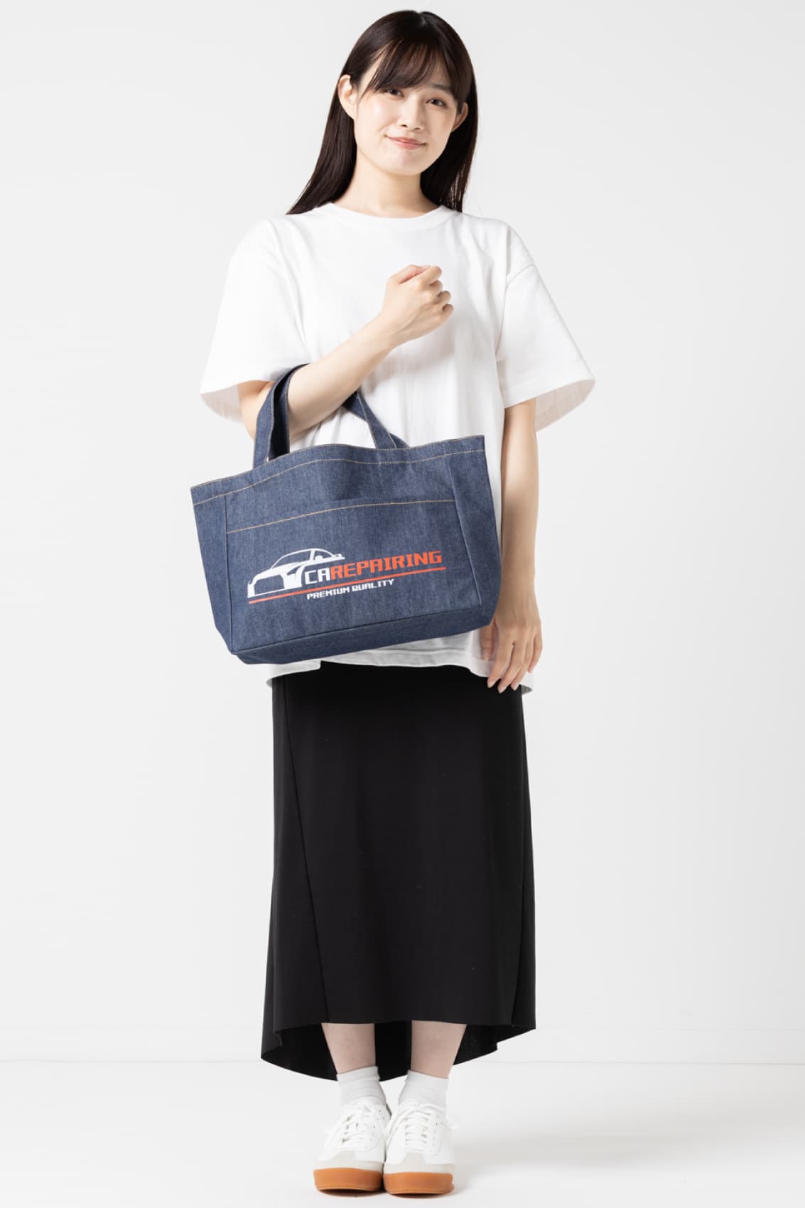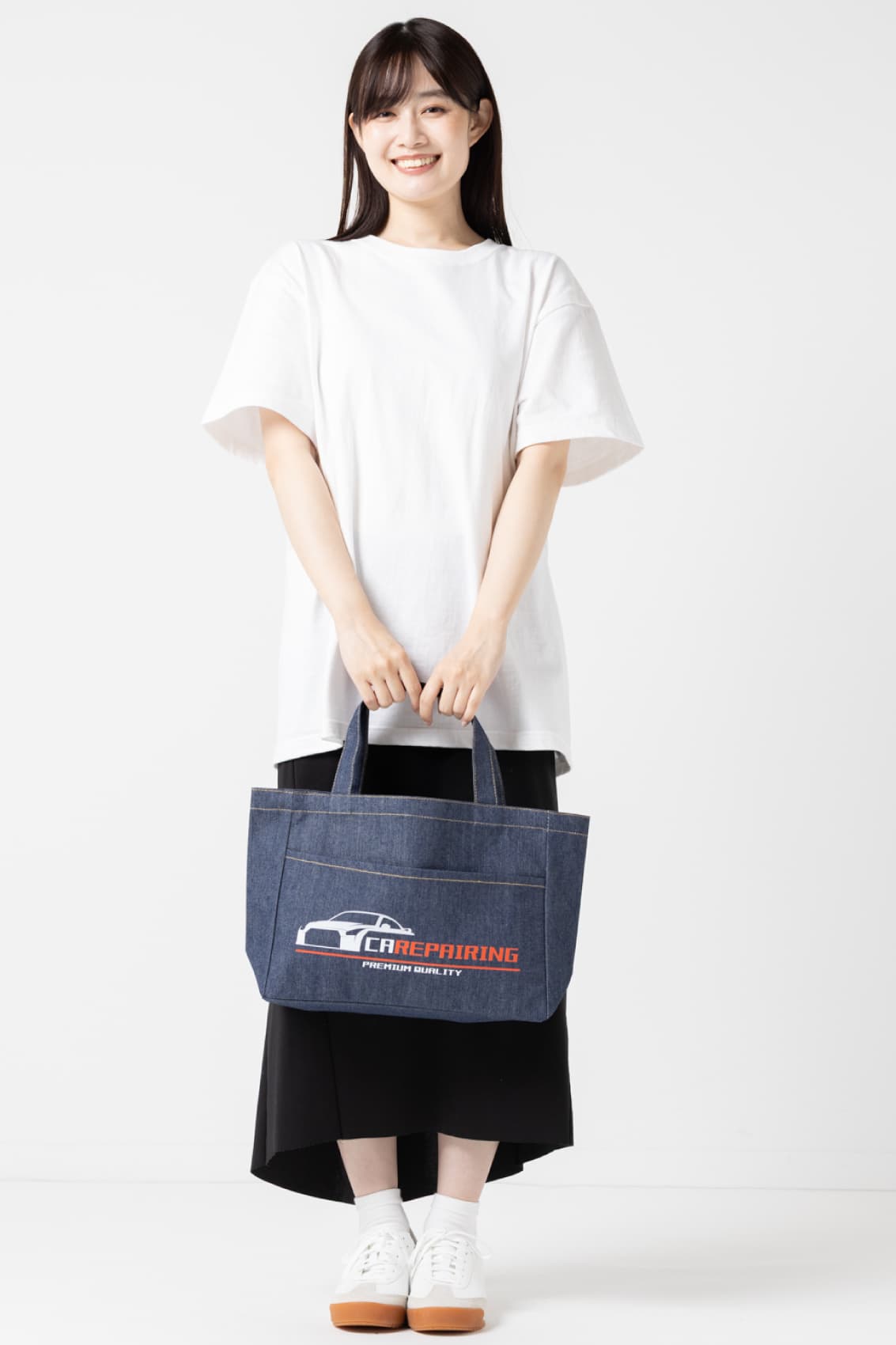 カジュアルなデニム生地を使用した、横型のトートバッグです。丈夫な厚みで荷物の多いシーンでも安心!A4サイズが横向きに入るサイズで、きちんとした印象を与える角形シルエットはお稽古バッグにもピッタリです。また企業ノベルティや、ブランドロゴやイラストをでデザインして物販用としてもおすすめです。フロント部分には外ポケットがついており、メモなどの小物を入れたり荷物の仕分けができるので、バッグの中をすっきりお使いいただけます。デザインのご相談もどうぞお任せください。