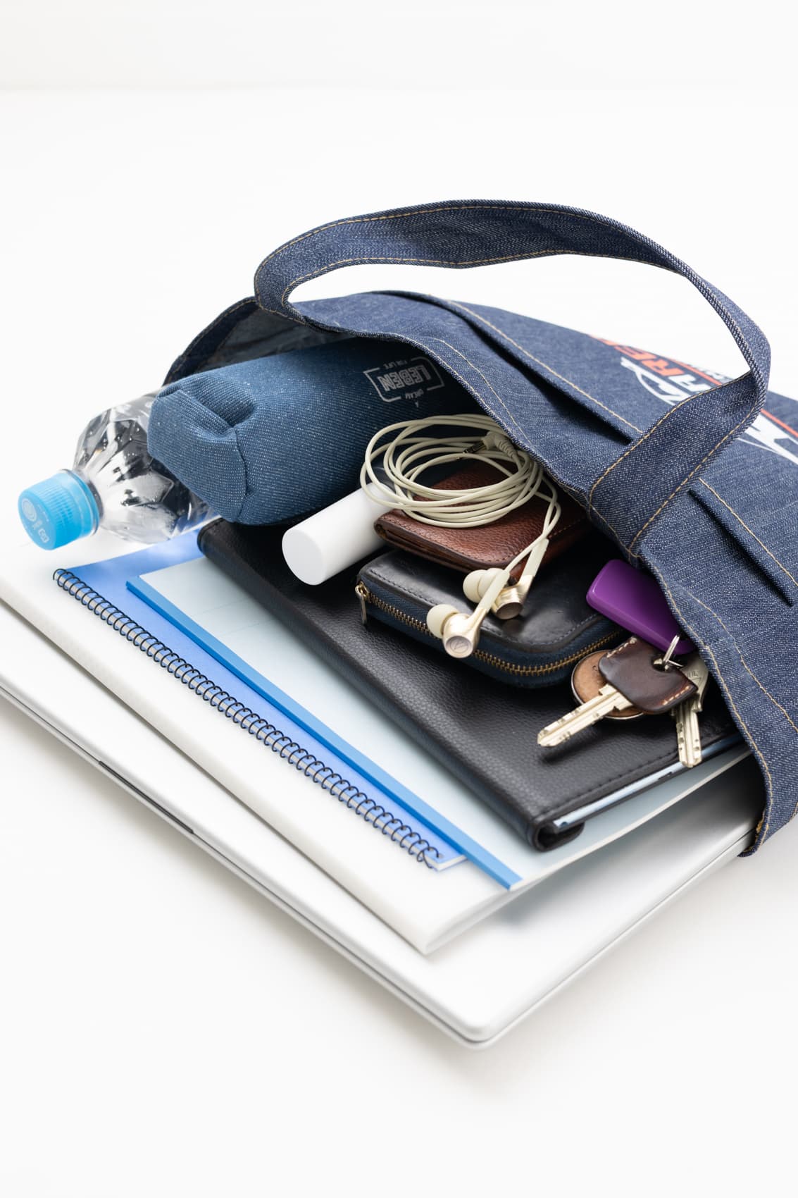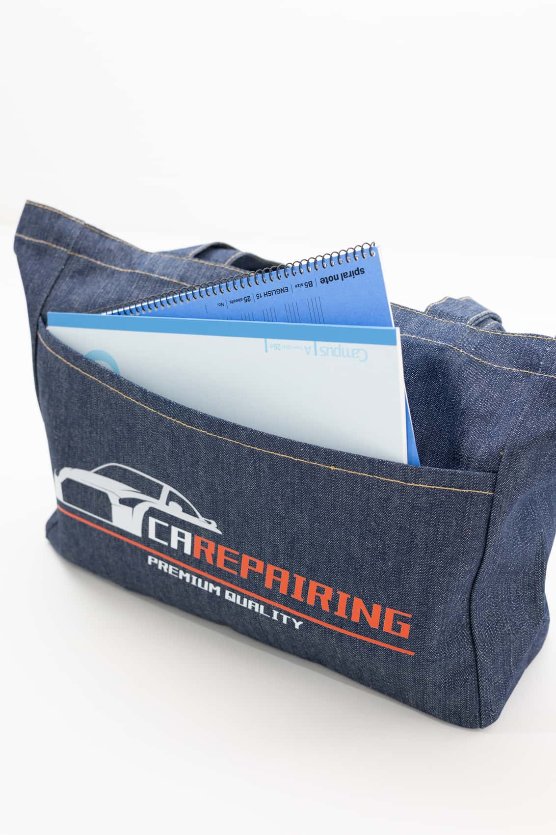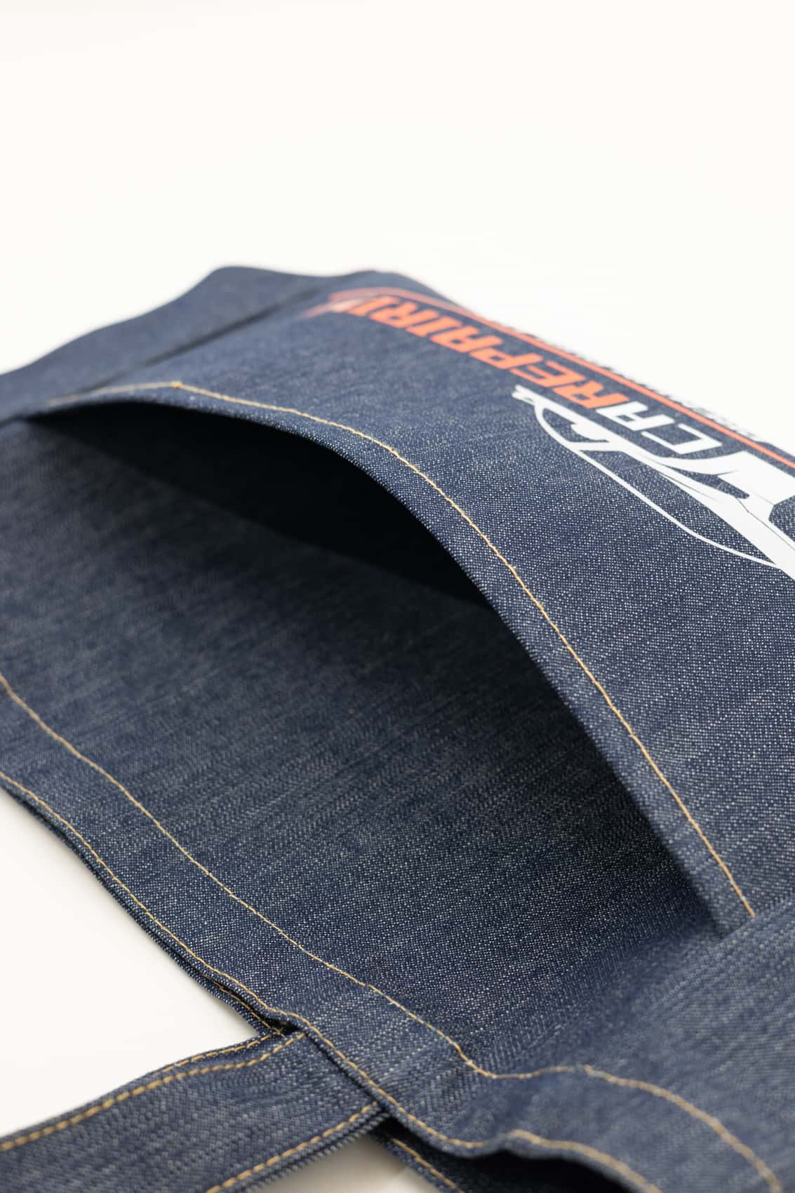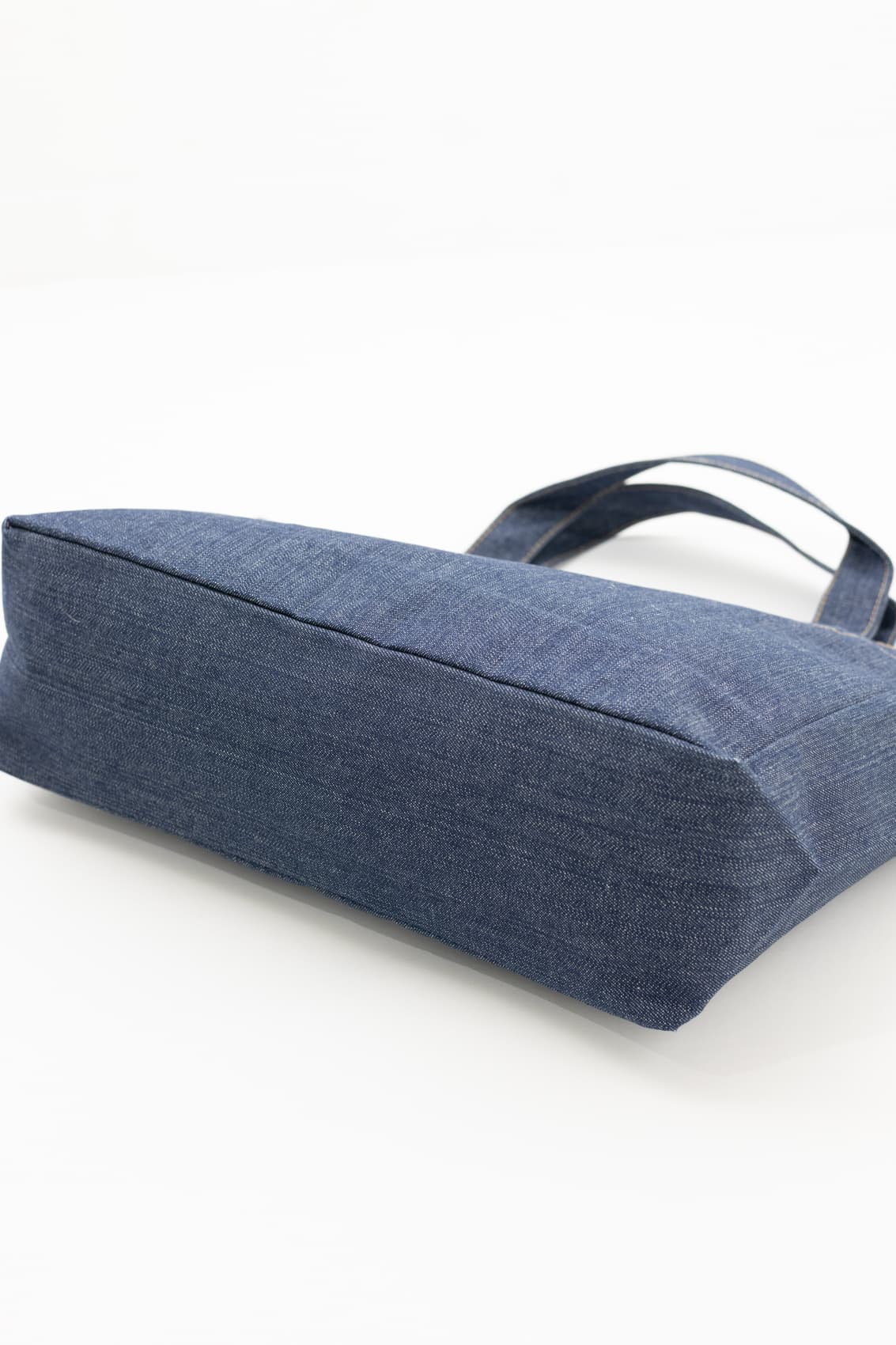 カジュアルなデニム生地を使用した、横型のトートバッグです。丈夫な厚みで荷物の多いシーンでも安心!A4サイズが横向きに入るサイズで、きちんとした印象を与える角形シルエットはお稽古バッグにもピッタリです。また企業ノベルティや、ブランドロゴやイラストをでデザインして物販用としてもおすすめです。フロント部分には外ポケットがついており、メモなどの小物を入れたり荷物の仕分けができるので、バッグの中をすっきりお使いいただけます。デザインのご相談もどうぞお任せください。