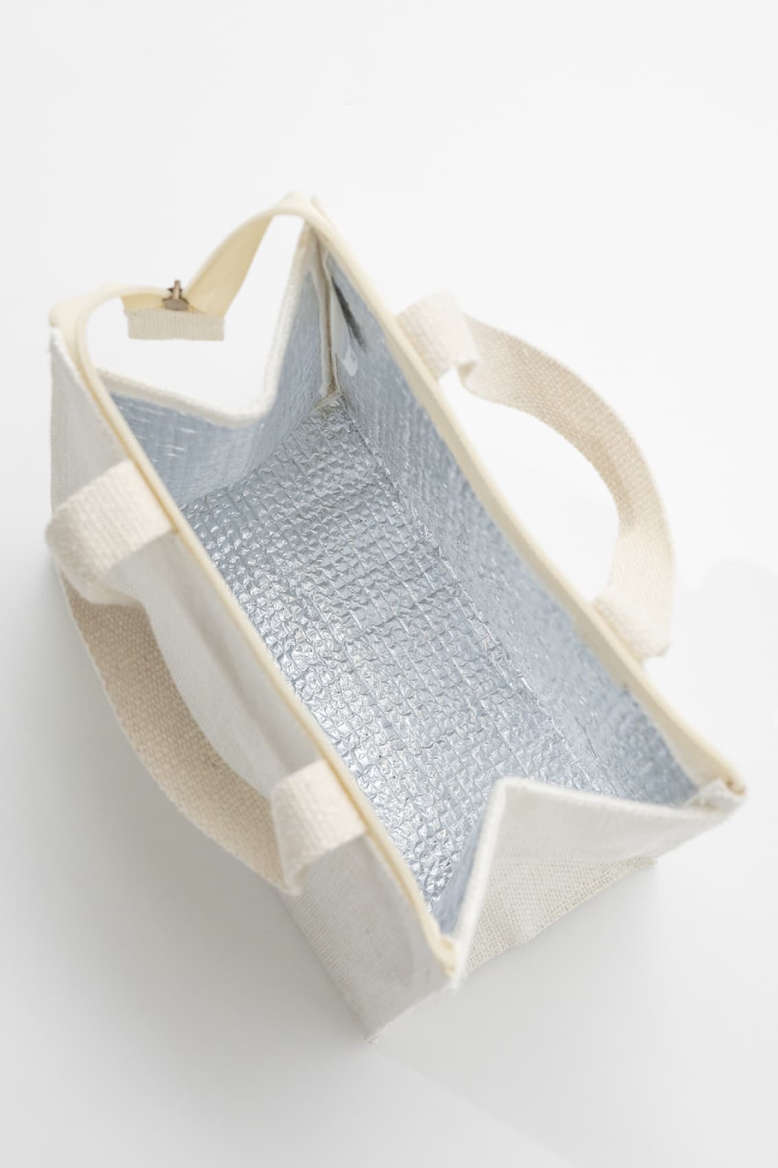 TR-1405 | MARKLESS STYLE大人気のジュート素材を使用した、暑い季節に涼しげな印象を与える保冷スクエアトートバッグです。食料品店の販促品や、お土産品店などのオリジナル保冷ショッパーとしてもおすすめ!レジャーやアウトドアはもちろんのこと、保冷バッグに見えないおしゃれなデザインで中身が見えないファスナー付きなので、普段使いにもご利用いただけます。サイズはしっかり荷物の入るM(品番TR-1223)との2サイズをご用意。こちらのSサイズはお弁当やペットボトルを入れて、ランチバッグとしてお使いいただくのにちょうど良い大きさになっています。