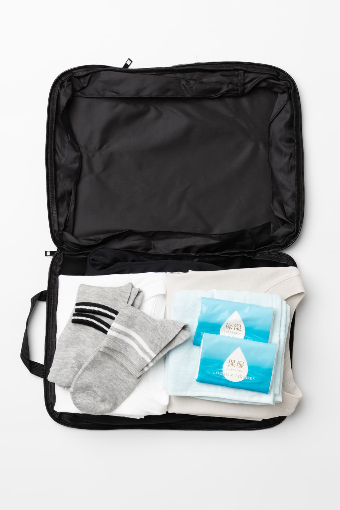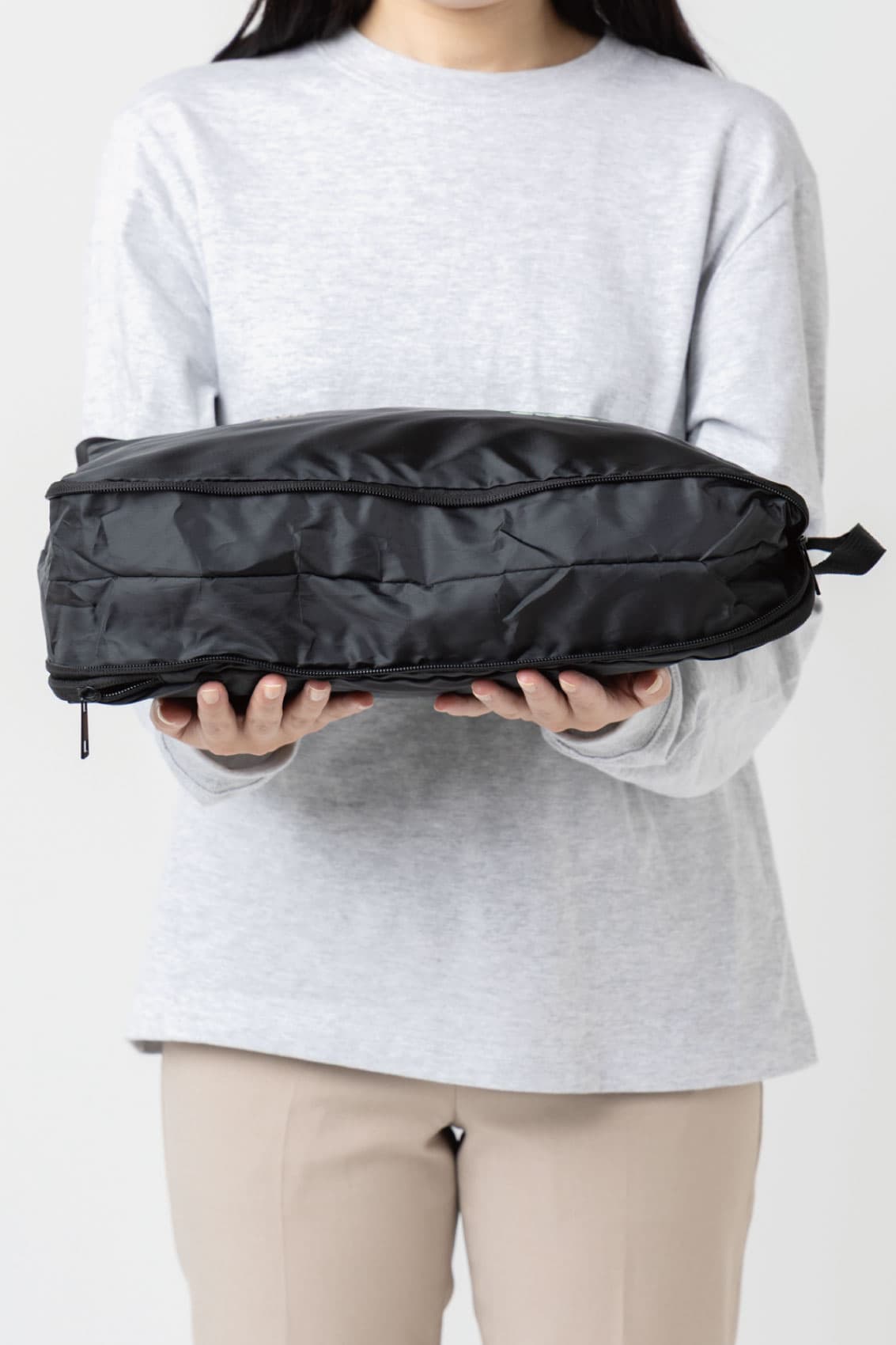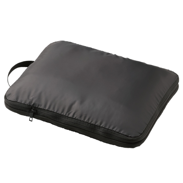 TP-0024 | MARKLESS STYLE出張や旅をスマートにする圧縮ポーチ。2カ所のファスナーで衣類をコンパクトに圧縮することで、荷物のかさばりを抑え旅行バッグのスペースを有効活用できます。旅行代理店や保険会社、レジャー関連の企業ノベルティ、旅のイベントプロモーション用として採用すれば、実用性の高さで喜ばれること間違いなし!こちらのMサイズは夏から秋の2泊程度に最適な大きさです。