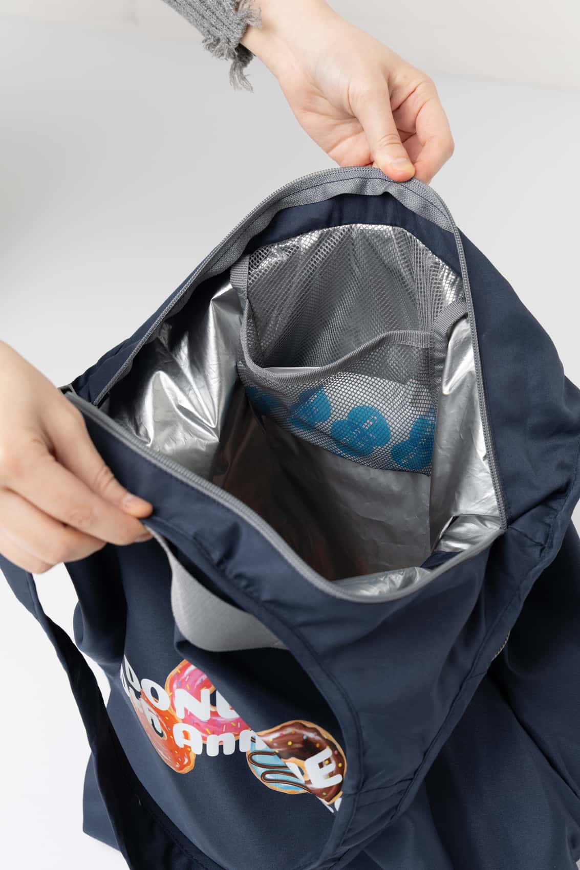 TR-1422 | MARKLESS STYLEセルフレジで重宝する、たっぷり入る保冷マルシェバッグ。底がしっかり広がり自立するので食品を入れやすく、本体外側のテープは左右どちらのバー設置にも対応します。中身のこぼれにくいファスナーや、しっかり保冷できる本体内側の保冷剤用メッシュポケットなど機能性も充実。食のイベントやノベルティ、スーパーなどのグッズ用として幅広く活用できる1枚です。