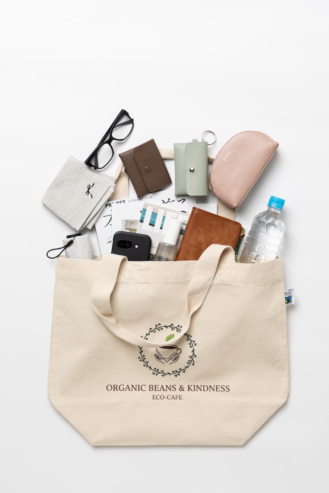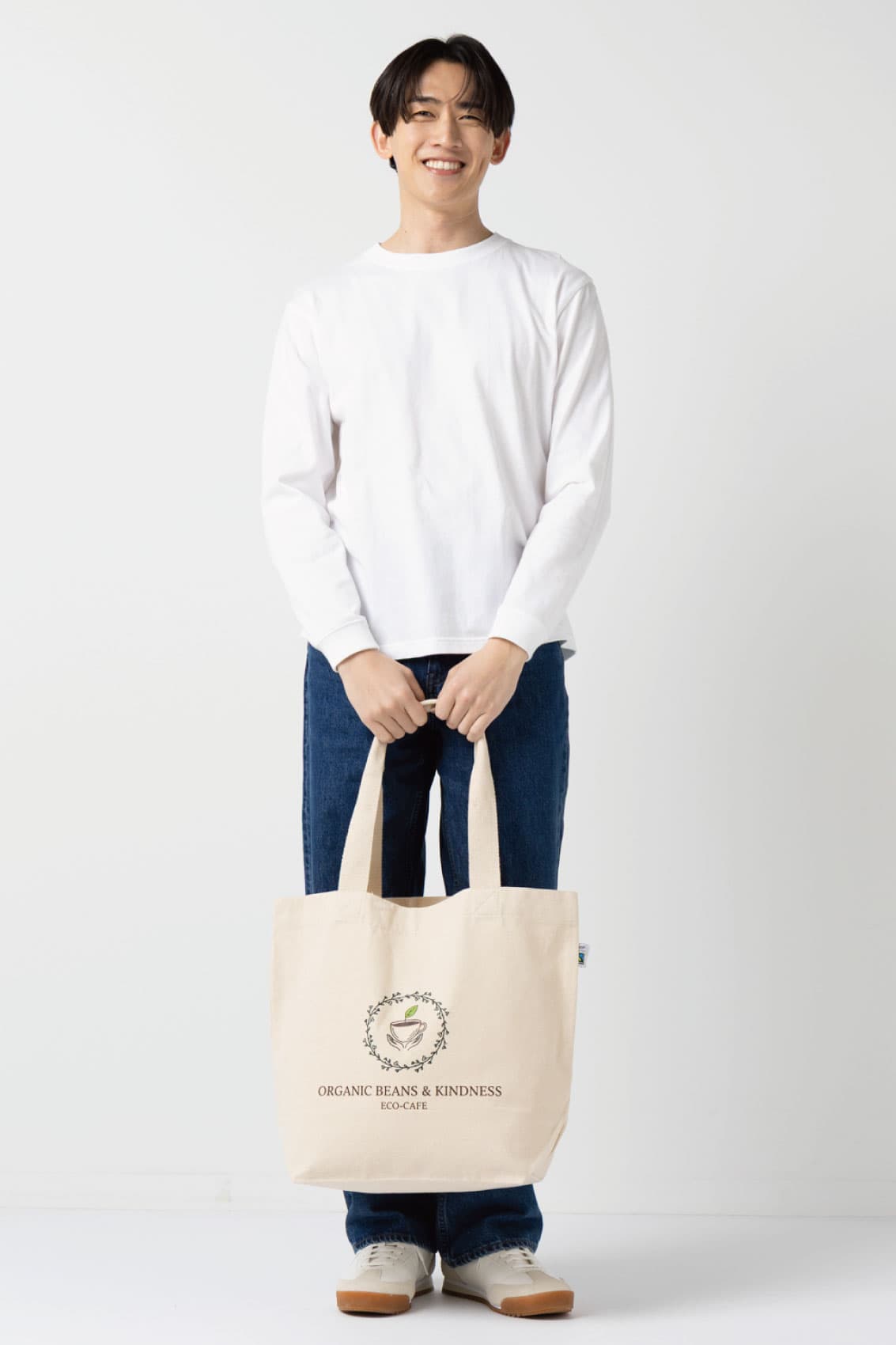 生地やひも、全ての素材にフェアトレード認証のオーガニックコットンを使用したバッグです。たっぷりと23Lの容量で、お買い物バッグや小旅行にも使用いただけます。肩に掛けて使用することができますので、重い荷物でも運びやすいです。カラーは、スタイリングにマッチしやすいものをご用意しました。国際フェアトレード認証コットンラベルも付いているので、企業様のSDGs活動を通したイメージアップにも活躍してくれることでしょう。