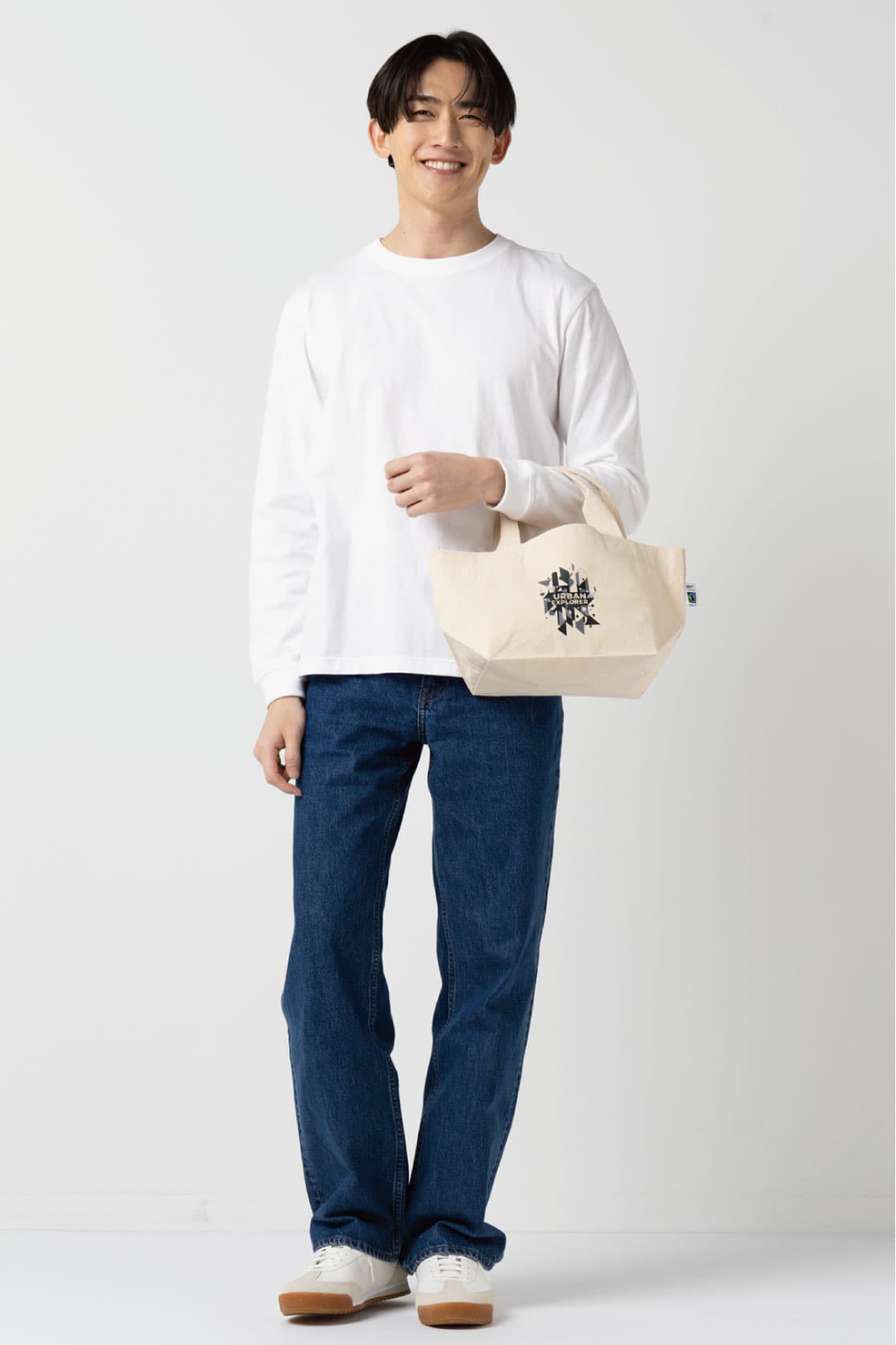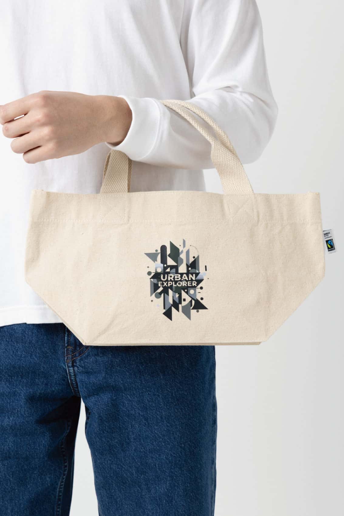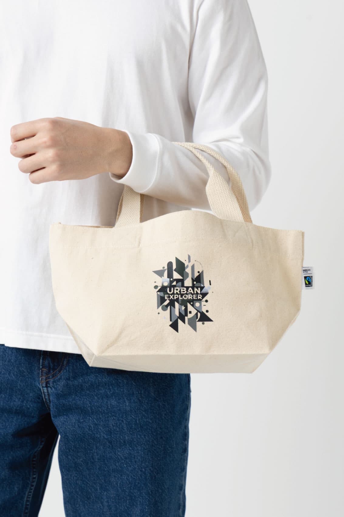 バッグ全ての部分にフェアトレード認証のオーガニックコットンを使ったバッグ。Sサイズはお弁当入れやちょっとしたお出かけにぴったり。持ち手は二つ折り縫製で持ちやすくなっています。スマートフォンや鍵など、バッグの中で迷子になりがちな小物を入れることができる内ポケットがついているので、使いやすさも抜群です。国際フェアトレード認証コットンラベルも付いているので、企業様のSDGs活動を通したイメージアップにも貢献すること間違いなしです。