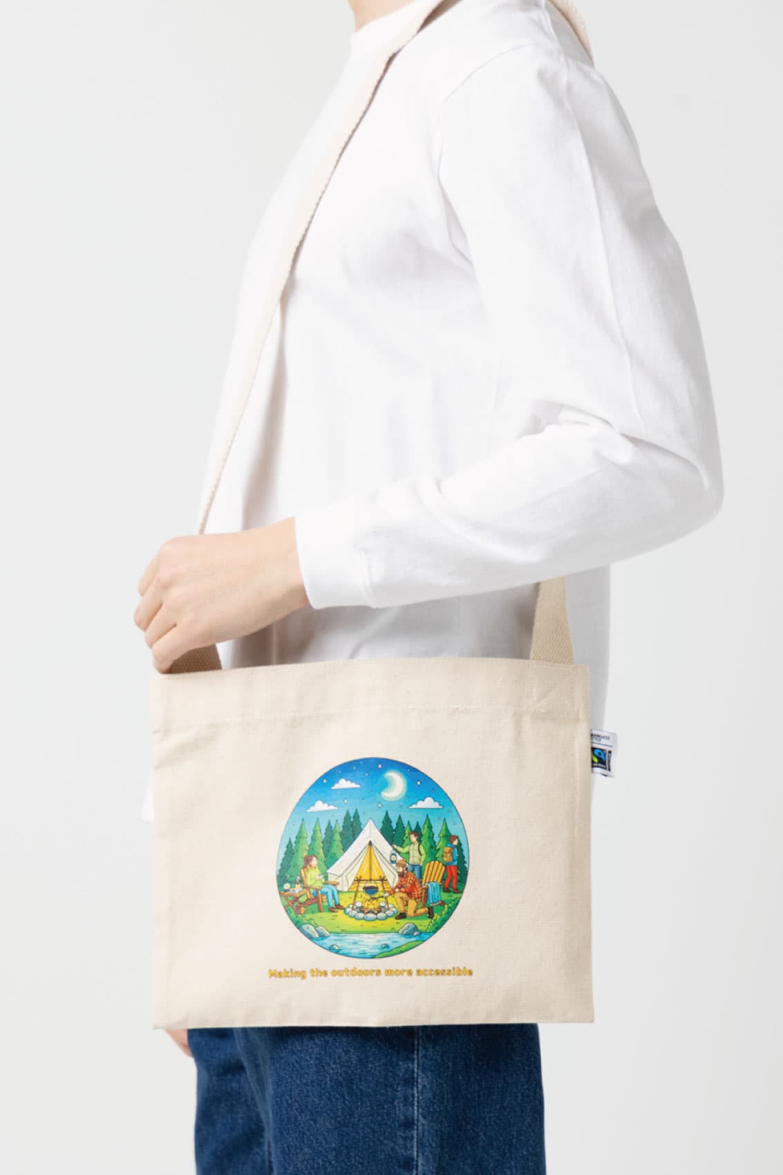 バッグ本体やショルダーテープ、全ての素材に「フェアトレード認証」のオーガニックコットンを使用したバッグです。透け感のないA4サイズ入る大きめのサコッシュ。バッグ内側にはスナップボタンが付いており、荷物が飛び出しにくくなっています。国際的に認められた素材を使用しているので、企業やショップのサステイナブルへの取り組みや安心安全をアピールするのにも適した商品です。※フェアトレードとは発展途上国の原料や製品を適正な価格で購入することで、そのような国の人々の生活改善や自立を支援する活動です。