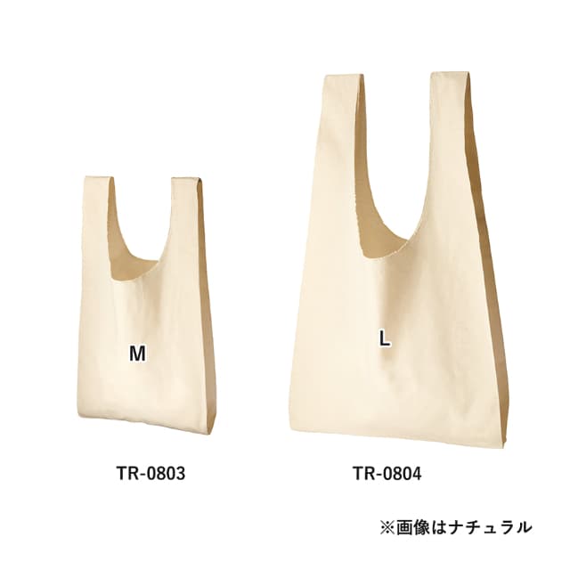 お買い物用としても大変便利な大容量のマルシェバッグ。厚めの生地で耐久性もあるので、たくさん買い物をしても安心です。シンプルでおしゃれなデザインで幅広い用途にお使い頂けます。持ち手も幅広なので、たくさん荷物を入れたときの負担を軽減してくれます。プリント範囲が大きくとれるので、企業販促用としても目立つこと間違いなしの商品です。こちらはSサイズ(TR-1380)、Mサイズ(TR-0803)もご用意しています。