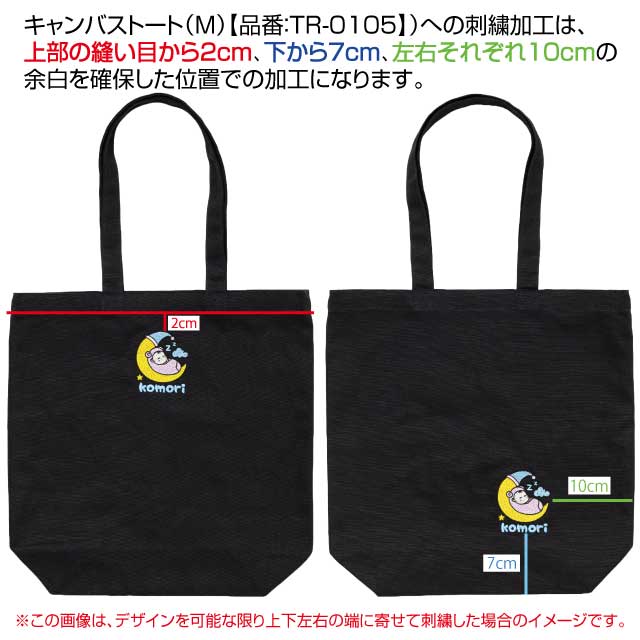 刺繍は、上縫い目から2cm、下から7cm、左右それぞれ10cmの余白を空けての加工になります。
