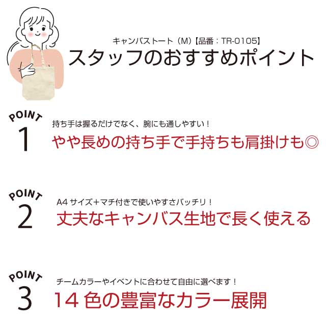 TR-0105 | MARKLESS STYLE肩掛け・手持ちの両方使える万能トートの紹介です。A4サイズのノートが収納できるサイズで、オープンキャンパスやセミナー、周年記念やイベントの記念品など幅広い用途やシーンに対応できます。無地でのご使用はもちろん、カフェやスイーツ店などショップのロゴやオリジナルのイラストをプリントすれば、おしゃれなトート、エコバッグとしてお客様の目を引くこと間違いなしのアイテムです。