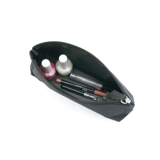 メイクポーチにもペンケースとしてもちょうど良い、三角型のポーチ。シンプルで飽きのこないデザインです。メイクブラシやビューラーはもちろん、モバイル周辺機器などをまとめるインナーケースとしても役立ちます。使いやすいブラックとミルキーベージュのカラーは様々な年齢層にマッチします。ロゴを入れて企業の配布用や学校などの記念品としてなど、幅広いシーンでお使い頂ける商品です。