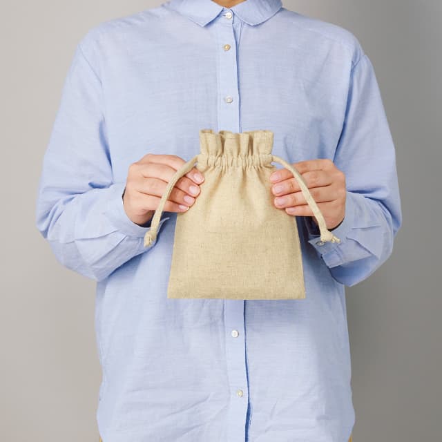 TR-0985 | MARKLESS STYLE可愛いサイズのミニ巾着。優しく素朴さが感じられるコットンリネン素材を使用しています。袋口をひもでしぼると上部分がくしゅっとなり、可愛さが溢れ出します。小さめのSサイズは小ぶりなコスメのギフトセットや、お菓子の詰め合わせのパッケージとしてもご利用いただけます。またネーム等を入れ、ショップでの来店者様へプチギフトとしてお渡しいただくのにも素敵です。