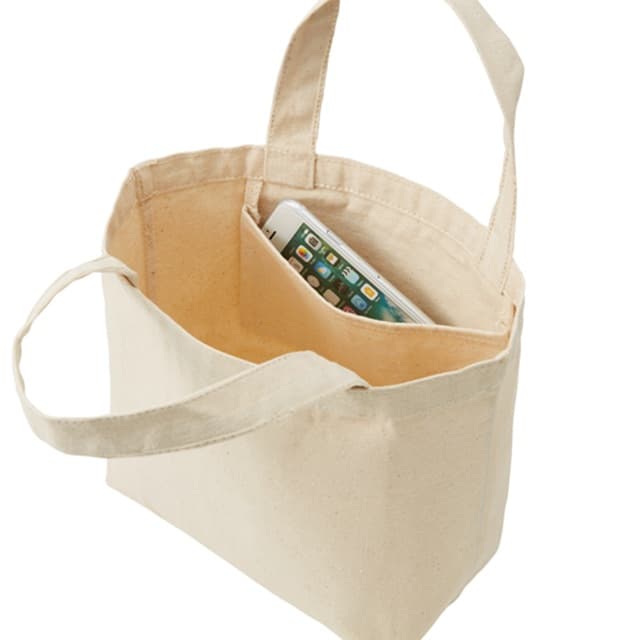 TR-0980 | MARKLESS STYLE厚みのあるコットン生地で人気の高い、Sサイズのトートバッグ。しかも嬉しいインナーポケット付き!鍵やティッシュなどの小物入れにたいへん便利です。お弁当バッグやちょっとした外出先で使うのに大活躍してくれる使い勝手の良いサイズです。ショップの名入れやロゴなどをプリントすれば、ノベルティとしても大変喜ばれます。さらに嬉しいキーホルダーフック付きなので、物販品としてキーホルダーとセット販売されてもご提案の幅が広がります。