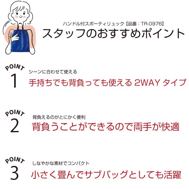 TR-0976 | MARKLESS STYLE手持ちでも背負っても使える、2WAYタイプの薄手ポリエステル素材のリュックです。軽量でA3サイズ程度まで収納出来るので、レジャーやスポーツアイテム、防災グッズとしてもおすすめです。しなやかな素材で多少幅のあるものも収納が可能。小さく畳んでサブバッグとして持ち歩くのにもとても便利です。1つ持っていると便利な、様々なシーンで頼りになる商品です。