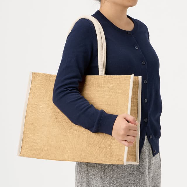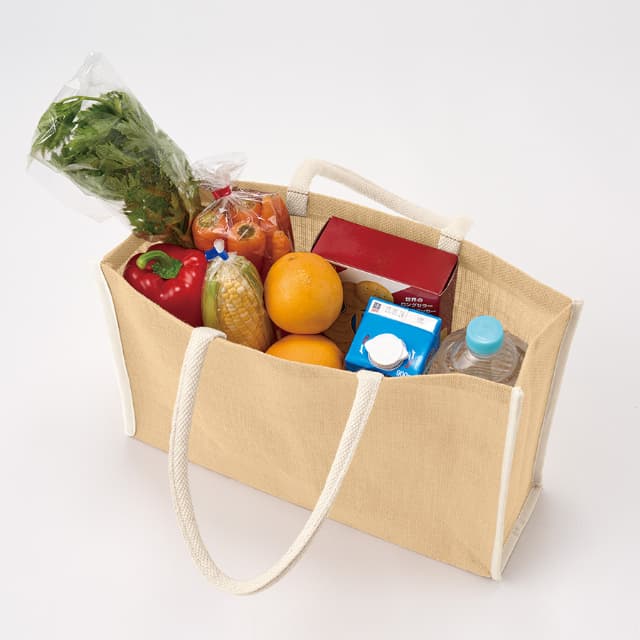 TR-1290 | MARKLESS STYLEバッグ側面のパイピングや持ち手部分にカラーの入った、ジュート素材のバッグです。ひと味違ったジュートバッグをお探しの方にぴったり!16Lと大容量のLサイズは、週末のお買い物やピクニックなどのレジャーにも便利なサイズ。2Lのペットボトルを縦に収納する事が可能です。オーガニックのコスメや食料品などを扱ったショップのパッケージとしてもおすすめです。
