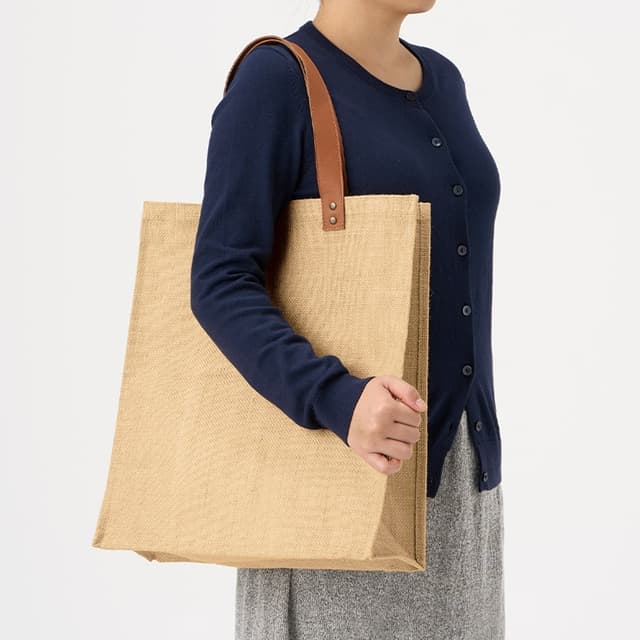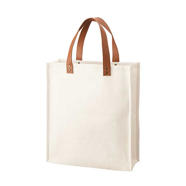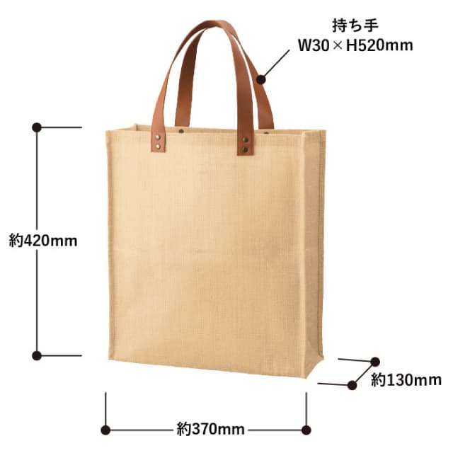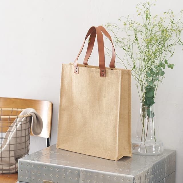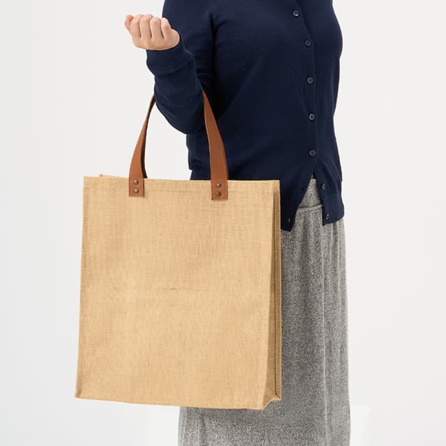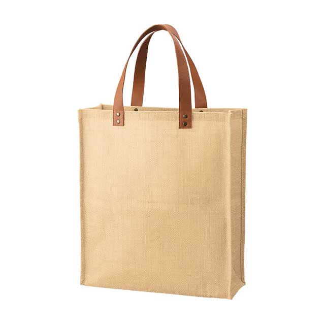 TR-1291 | MARKLESS STYLE持ち手部分に合皮を使った、ファッショナブルなジュート素材バッグです。ジュートでは珍しい縦長バッグで、持ち手外側の丸スタッズがアクセントになっています。 大きいスケッチブックが入るサイズで、しっかりとしたマチもあるので収納力も抜群です。ジュート部分はシンプルなデザインになっており、デザインを入れた際もしっかり映えます。ショップのオリジナルグッズとしてもおすすめです。