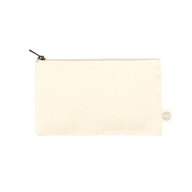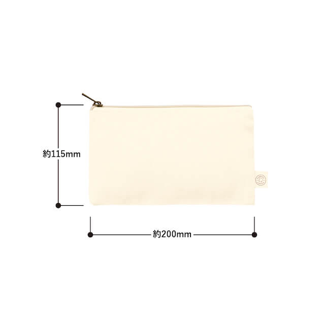 TR-1307 | MARKLESS STYLEオーガニックコットンを使用したフラットポーチです。バッグに収納しやすいフラットな形かつ、シンプルなデザインなのでオリジナルロゴやキャラクターデザインなどを入れた際にも映えます。また引手部分にはアンティークゴールドを使用し、高級感のある印象に仕上げました。サイズは全部で3種類をご用意しました。こちらのSサイズは文具や名刺入れなどを入れるのにおすすめのサイズになっています。
