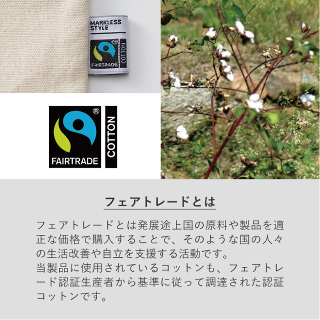 TF-0007 | MARKLESS STYLE生地やひも、全ての素材にフェアトレード認証のオーガニックコットンを使用した巾着です。Tシャツやフェイスタオルなど、ちょっとしたお出かけや旅行に持ち運ぶのにピッタリです。普段の生活にも馴染む優しいナチュラルなカラーなので、使用用途も限定されず使いやすいのが魅力的です。国際フェアトレード認証ラベルが付いているので、企業様のSDGs関連の活動やイメージアップにもご活用いただけます。