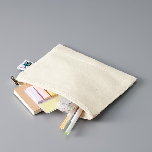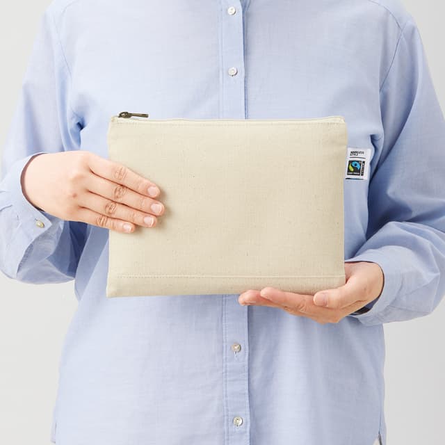 TF-0009 | MARKLESS STYLEフェアトレード認証のオーガニックコットンを使用した、バッグにすっきり収まるフラットポーチです。カラーは使いやすい5色をご用意しました。こちらのMサイズは文具やイヤホン、化粧品を入れるのにおすすめです。厚みがあり丈夫な生地で作られているため中身が透けることもなく、長くご愛用いただけます。販売用としてはもちろん、オリジナルのデザインを施して大切な方へのプレゼントなどにいかがですか。