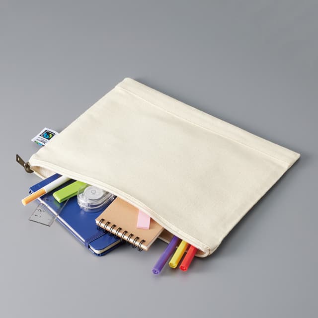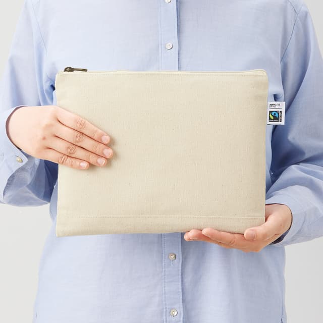 TF-0010 | MARKLESS STYLEフェアトレード認証のオーガニックコットンを使用した、バッグにすっきり収まるフラットポーチです。カラーは5色あり、使いやすい色ばかり。チームのメンバーそれぞれで好きな色を選び、お揃いのポーチを作ってみてはいかがでしょう。B5サイズのノートも収納できる大きさで、学校や仕事の持ち物をまとめるのに最適です。厚みがあり丈夫な生地で作られているため中身が透けることもなく、長くご愛用いただけます。