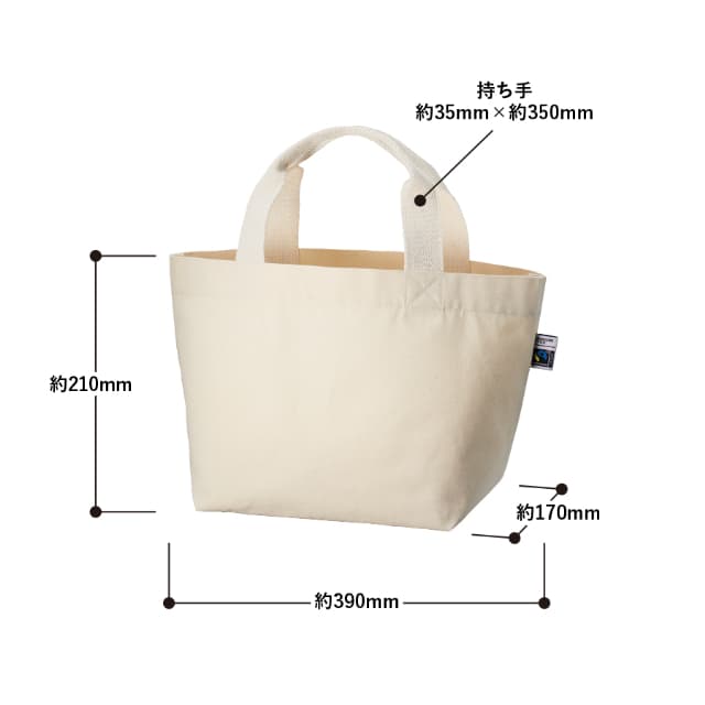 バッグ全ての部分にフェアトレード認証のオーガニックコットンを使ったバッグ。Sサイズはお弁当入れやちょっとしたお出かけにぴったり。持ち手は二つ折り縫製で持ちやすくなっています。スマートフォンや鍵など、バッグの中で迷子になりがちな小物を入れることができる内ポケットがついているので、使いやすさも抜群です。国際フェアトレード認証コットンラベルも付いているので、企業様のSDGs活動を通したイメージアップにも貢献すること間違いなしです。