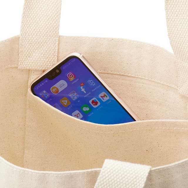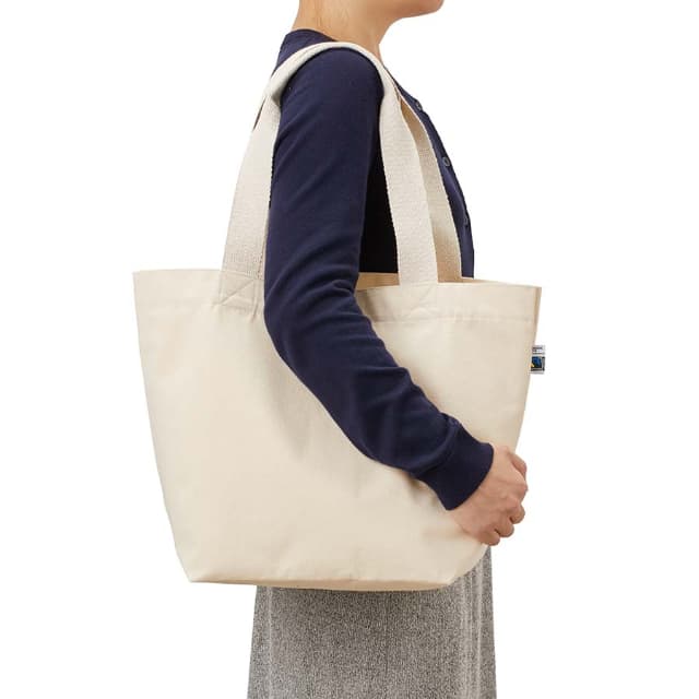 バッグ全ての部分にフェアトレード認証のオーガニックコットンを使ったバッグ。持ち手部分は二つ折り縫製のため、手で持ったり、肩掛けした際にも負担がかかりにくい仕様になっております。広めのマチ付きで重い荷物も楽々持ち運びできます。スマートフォンや鍵など、バッグの中で迷子になりがちな小物を入れることができる内ポケットがついているので、使いやすさも抜群です。国際フェアトレード認証コットンラベルも付いているので、企業様のSDGs活動を通したイメージアップにも最適です。