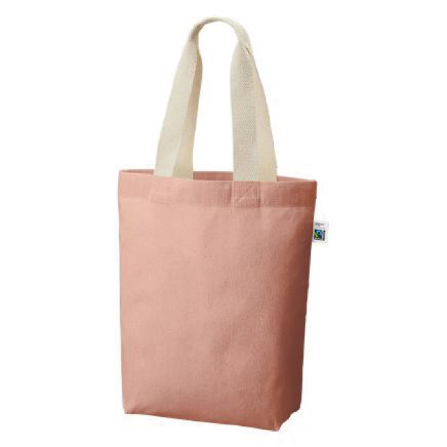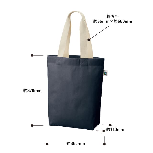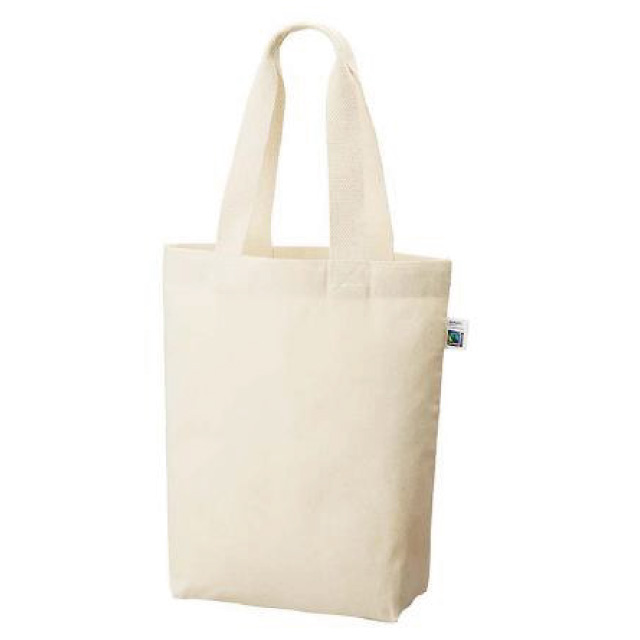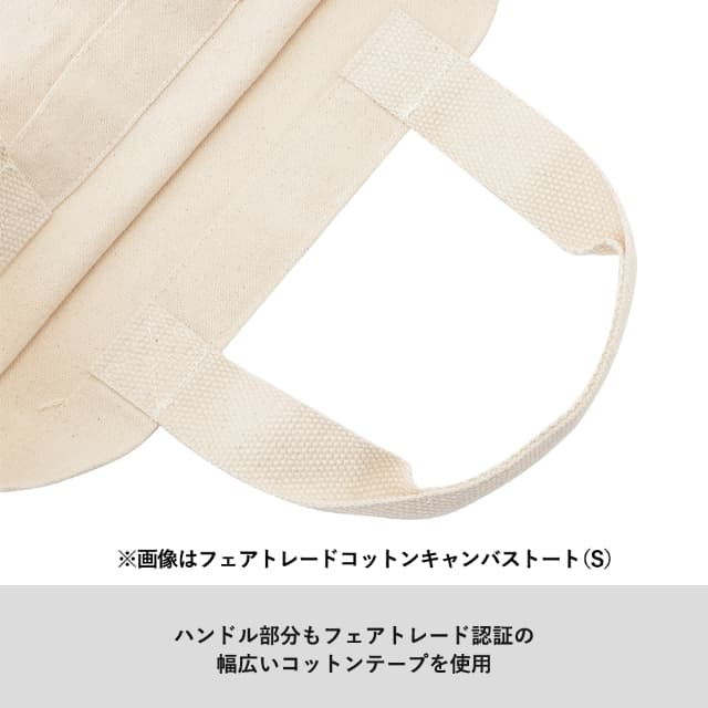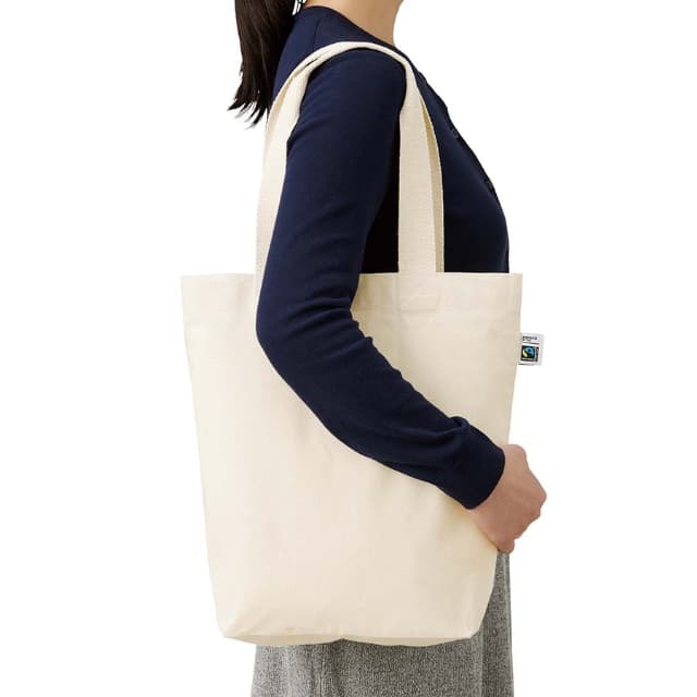 バッグ本体や持ち手、全ての素材に「フェアトレード認証」のオーガニックコットンを使用したバッグ。幅広い用途に使いやすいA4サイズが入る船底型のマチで、厚みの無い荷物の際は底を畳んだ状態でもご使用頂けます。持ち手部分は二つ折り縫製を採用。国際的に認められた素材を使用しているので、企業やショップのサステイナブルへの取り組みや安心安全をアピールするのにも適した商品です。※フェアトレードとは発展途上国の原料や製品を適正な価格で購入することで、そのような国の人々の生活改善や自立を支援する活動です。