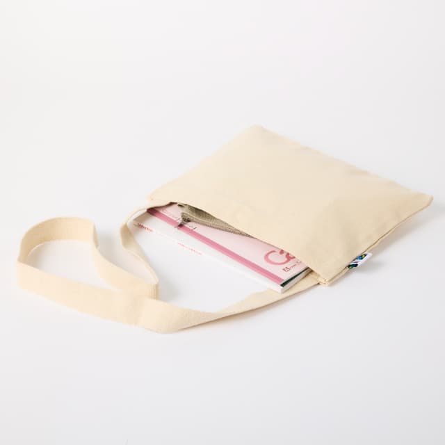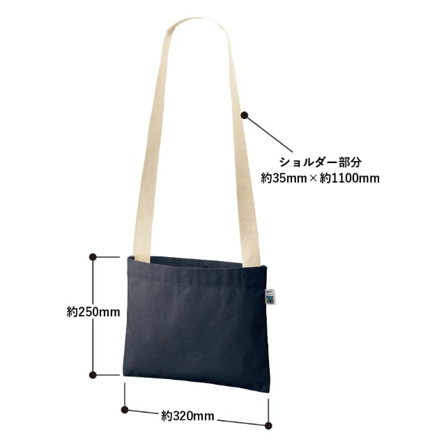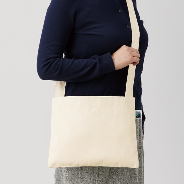 バッグ本体やショルダーテープ、全ての素材に「フェアトレード認証」のオーガニックコットンを使用したバッグです。透け感のないA4サイズ入る大きめのサコッシュ。バッグ内側にはスナップボタンが付いており、荷物が飛び出しにくくなっています。国際的に認められた素材を使用しているので、企業やショップのサステイナブルへの取り組みや安心安全をアピールするのにも適した商品です。※フェアトレードとは発展途上国の原料や製品を適正な価格で購入することで、そのような国の人々の生活改善や自立を支援する活動です。