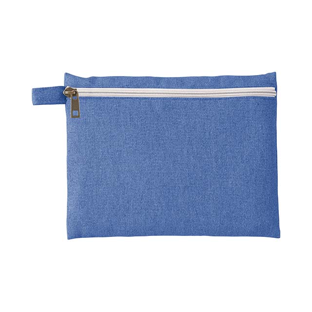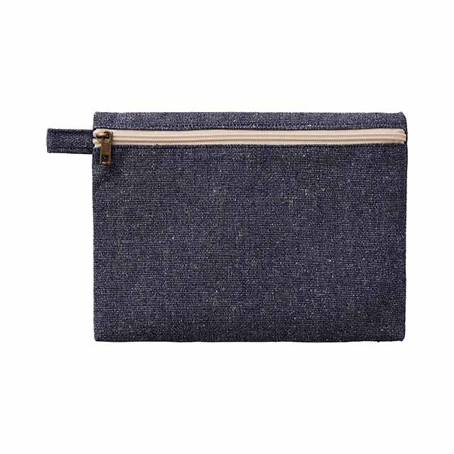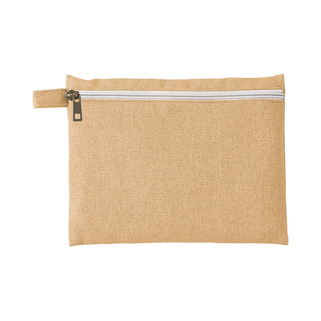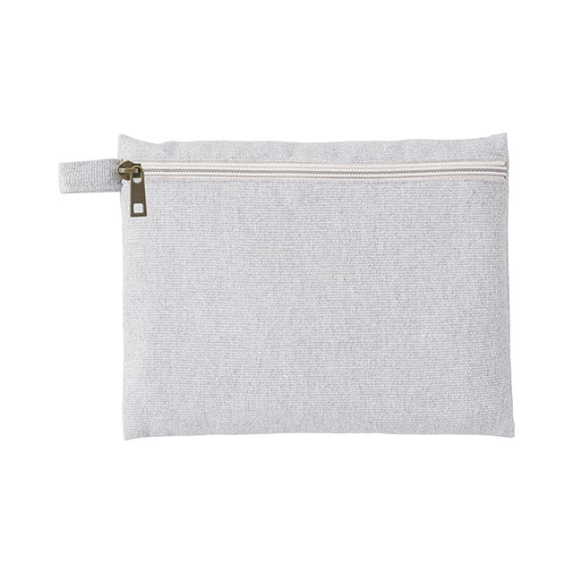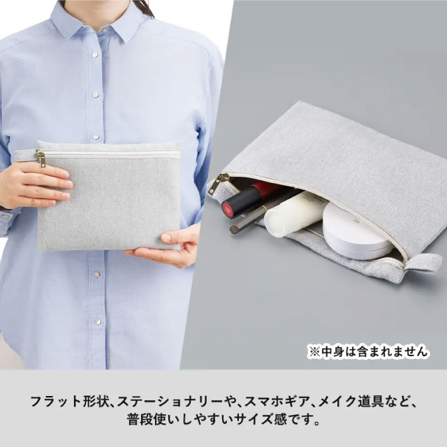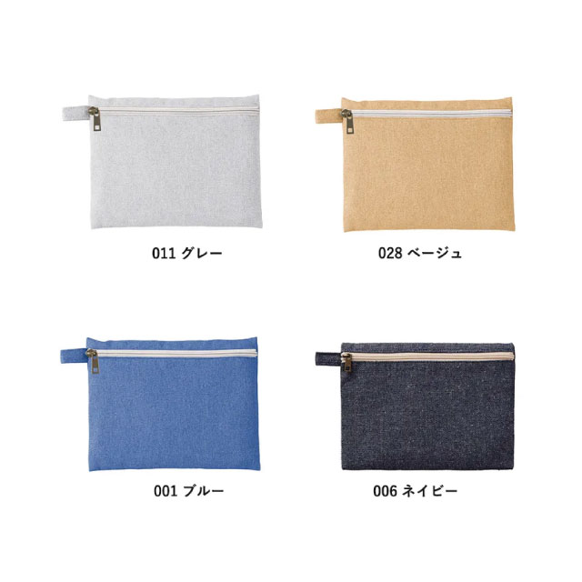 再生素材を使用した、普段使いしやすいフラット形状タイプのポーチです。フラット面にファスナーがついている為、カラビナやボールチェーン等につなげて持ち運ぶことができます。大きめの手鏡や細々としたコスメなど、化粧ポーチとしてもぴったりのアイテムです。ショップの購入品特典やオープンキャンパスのノベルティ用などにおすすめしたい商品です。