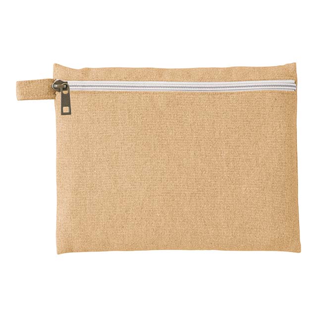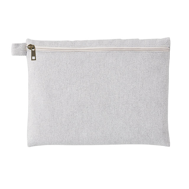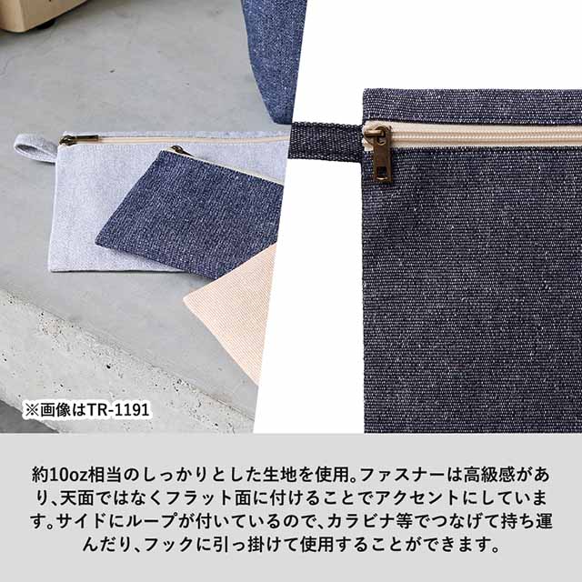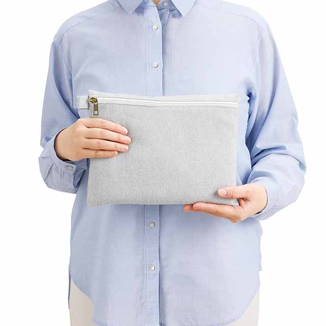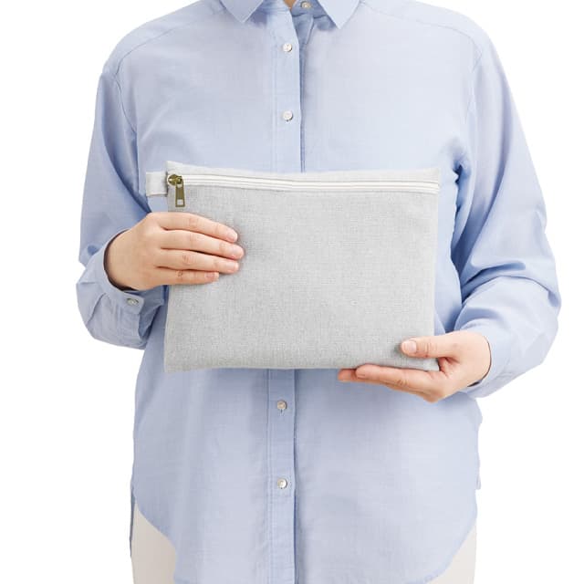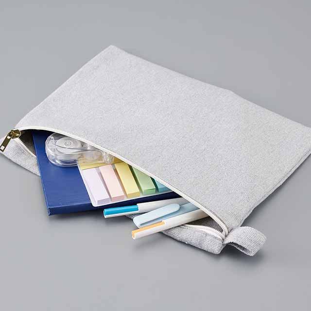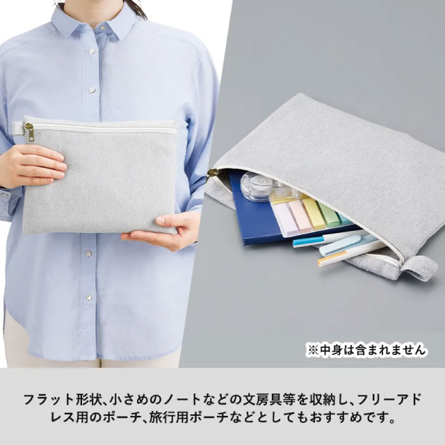 再生素材を使用した普段使いしやすいフラット形状タイプのポーチです。フラット面にファスナーがついているため、カラビナやボールチェーン等につなげて持ち運ぶことができます。旅行時の小分けケースとしても、ペンや付せんなどの文具を持ち運ぶポーチとしてもご活躍いただけるアイテムです。ショップの購入品特典やオープンキャンパスのノベルティなどおすすめの商品です。