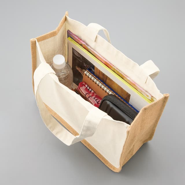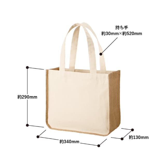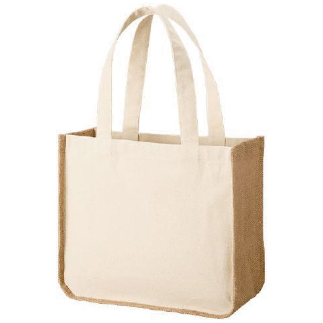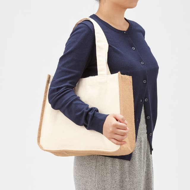 TR-1218 | MARKLESS STYLE大人気のジュートシリーズに、キャンバス素材と組み合わせた「ジュート&キャンバス」シリーズが登場です!地球にやさしい天然素材を使用しているジュートバッグは大人気のアイテム。底角がラウンドした形状を取り入れ、やさしく可愛らしい印象のバッグになりました。こちらのMサイズはA4サイズの書類がぴったり入ります。程よい長さの持ち手でショルダーバッグとしても活用できます。ショップのオリジナルグッズにいかがですか。
