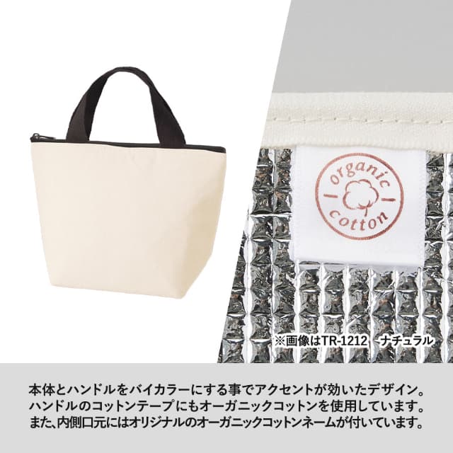 オーガニックコットンで作られた保冷バッグのご紹介です。持ち手のコットンテープにもオーガニックコットンを使用しており、バッグ内側にはオリジナルのオーガニックコットンラベルが付いています。Mサイズはマチが広く見た目よりも大容量!肩にかけられるハンドルの長さで持ちやすくなっています。週末のお買い物やアウトドアなど幅広く活躍ができる商品で、ノベルティやグッズとしてもおすすめです。こちらはSサイズ(品番:TR-1212)のご用意もございます。