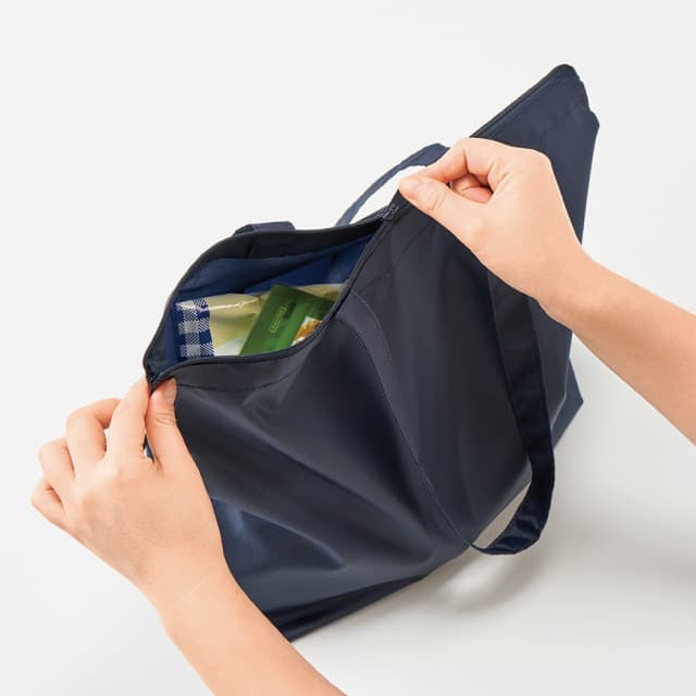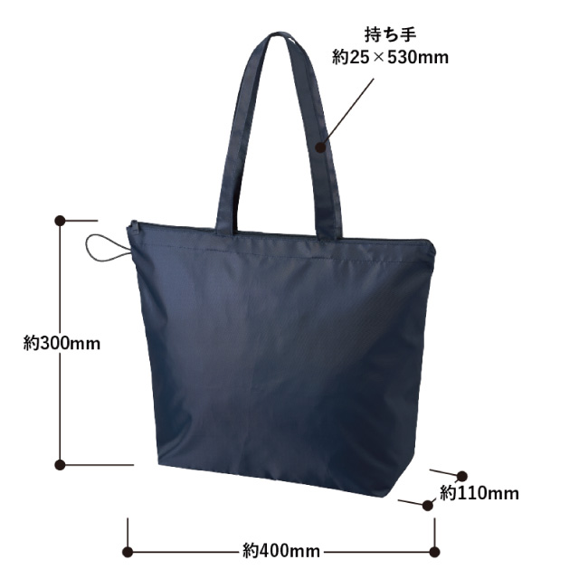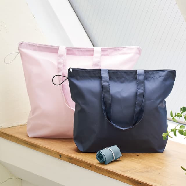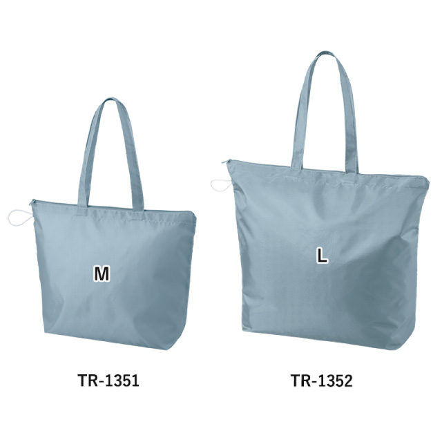 TR-1351 | MARKLESS STYLEファスナー付きで安心なポケッタブルトートバッグです。 コーティングを施しているため、耐久性があります。 たくさんお買い物をしたときや、荷物が多いときにもファスナーを閉めれば、 中身を見られることがなく、荷物が飛び出る心配もないため安心して使用することができます。 また旅行の際、サイドのゴムでコンパクトにまとめて持っておけば、 お土産など荷物が増えてしまったときにもサブバッグとして重宝します。 M・Lの2サイズ展開で、MサイズはA4サイズが横向きにきれいに収まるサイズ感です。
