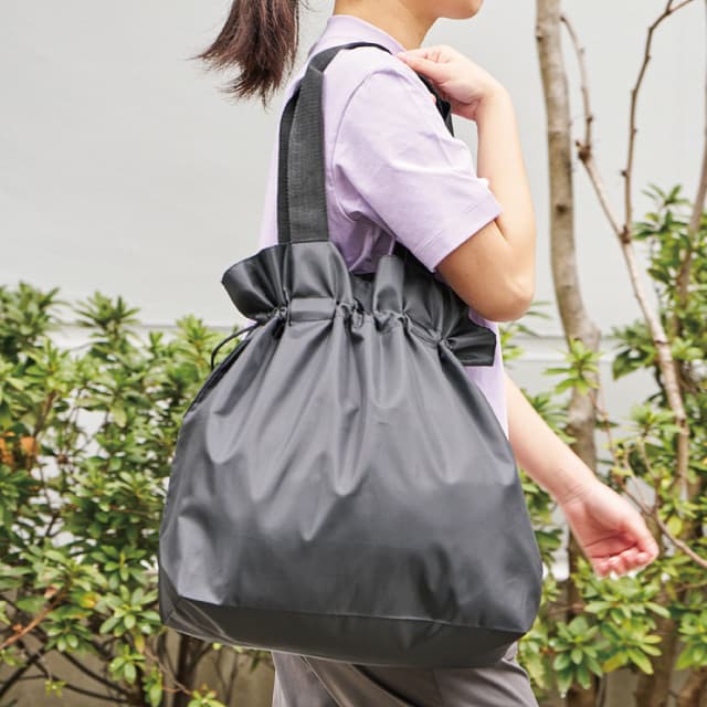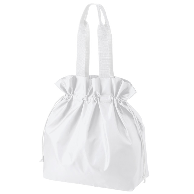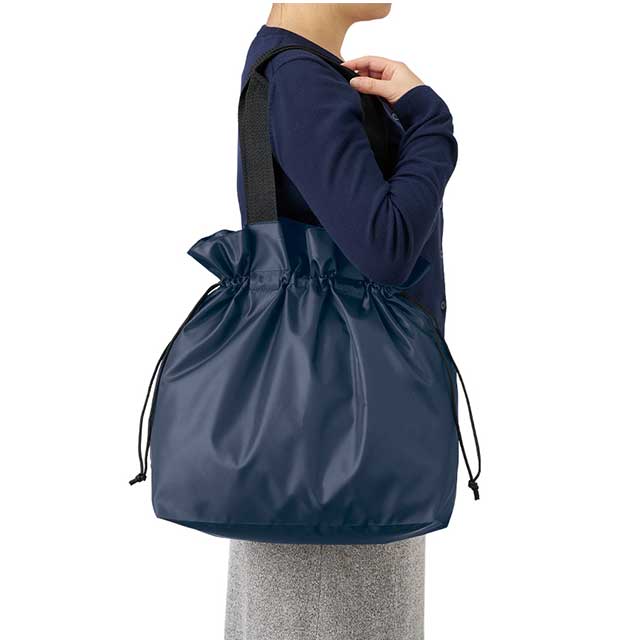 TR-1354 | MARKLESS STYLE巾着タイプのポリエステルトートバッグ。大きく口が開くので荷物の出し入れがしやすく、ひもをきゅっと絞ることで中身の落下防止にもなるため、安心してご使用いただけます。持ち手上部は二つ折り仕様になっており、肩掛けしやすく荷物が多いときにもぴったりです。サイズはM・Lの2種類。Lサイズは2Lペットボトルがきれいに入ります。お買い物バッグとしてはもちろん、ジムバッグなどアクティブシーンにも活躍します。