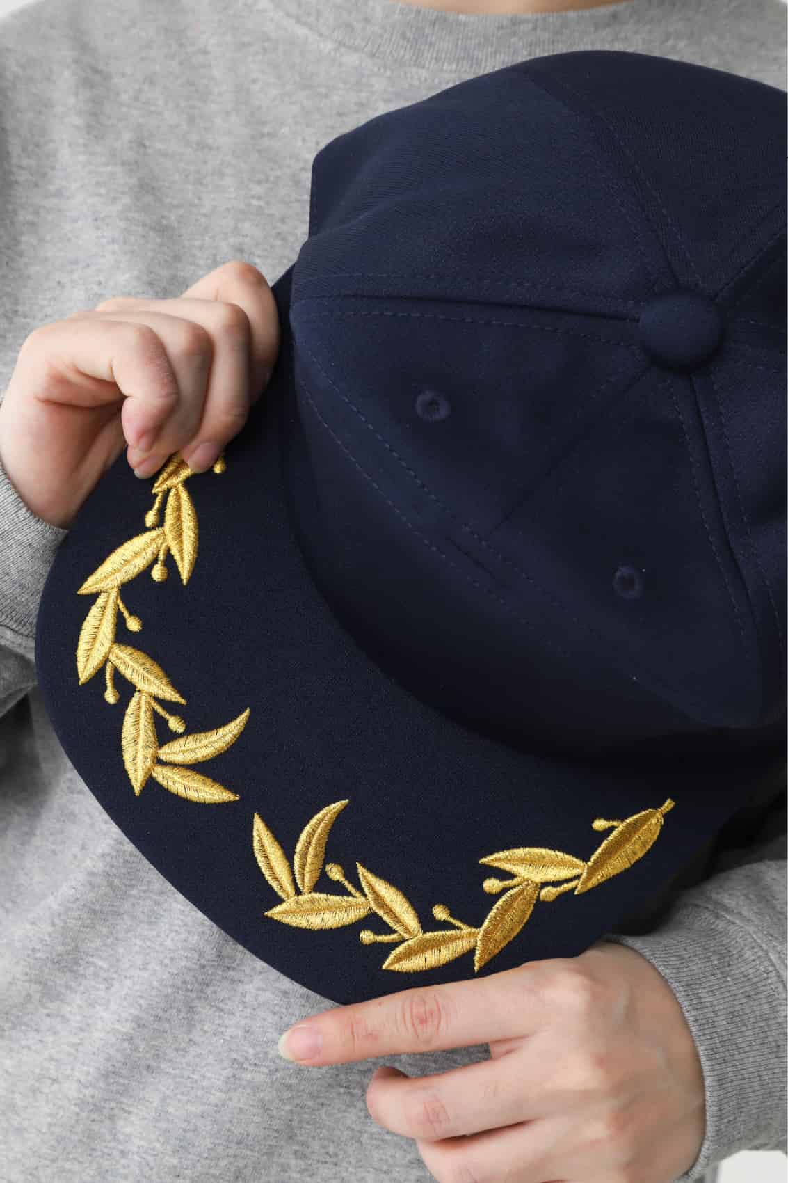 E1 | POINTSKYWARDつば部分に月桂樹の刺繍を施した、高級感あるキャップです。お仕事用だけでなく、素敵なプリントや刺しゅうを入れて、おしゃれにかっこ良く被って頂くのもおすすめ!葉のカラーは金糸・銀糸の2タイプ。ニット生地で柔らかく被りやすい商品です。レールアジャスターでサイズ調整が可能です。