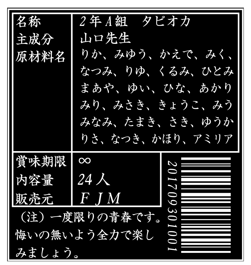 先日作成していただいたTシャツは本校の文化祭で着用させていただきました。生徒も「お気に入りです!」ととても喜んでいました。 おかげさまで、文化祭を大変盛り上げることができました。本当にありがとうございました。