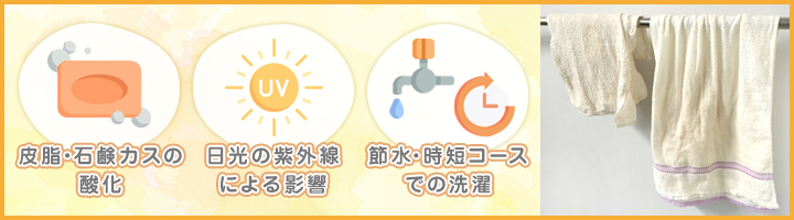 まずは、タオルがなぜ黄ばむのか、原因を特定しましょう。考えられる黄ばみの原因は、以下の3つです。