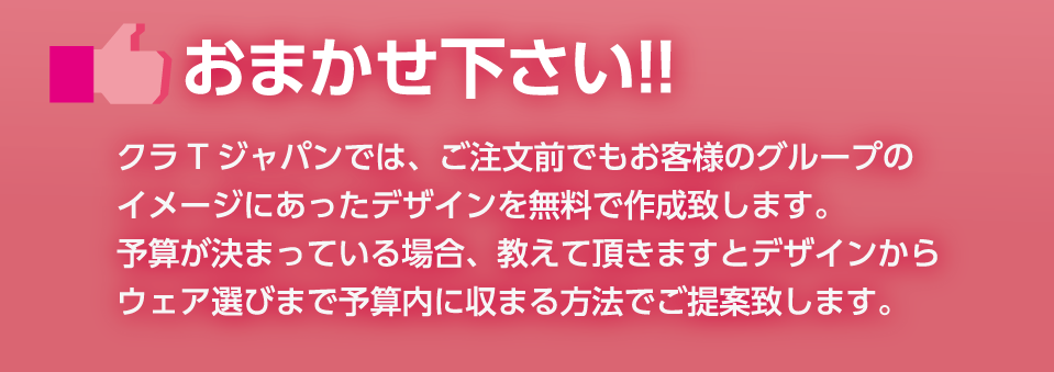 CLAT-JAPANでは、ご注文前でもお客様のイメージにあったデザインを無料で作成致します。 予算が決まっている場合でもデザインからウェア選びまで予算内に収まる方法で、ご提案いたします。デザインは「無料」でご提案します!