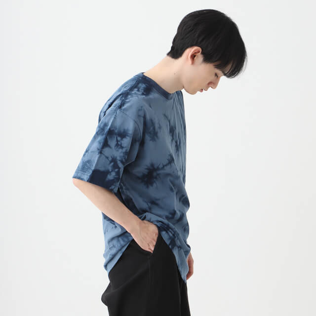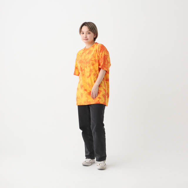 TDT-148 | TRUSSぱっと目を引くムラ染めのタイダイTシャツ。厚手の綿100%のざっくりとした生地で、1枚1枚異なる染めのデザインが着こむほどに奥深い色合いになっていきます。音楽イベントでの着用や、普段のおしゃれ使い等にも目立ってかっこいい商品です。※染加工時の縮みにより商品のサイズに個体差が生じることがあります。また、製品の特性上水や摩擦により、色落ちや移染する場合がございますのでお取扱いにはご注意ください。